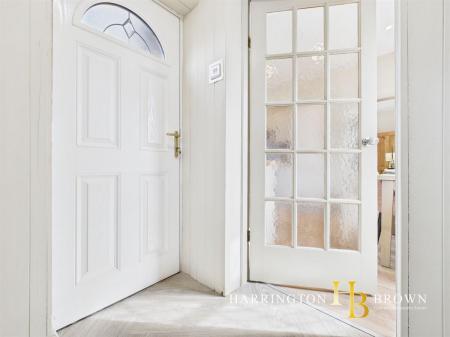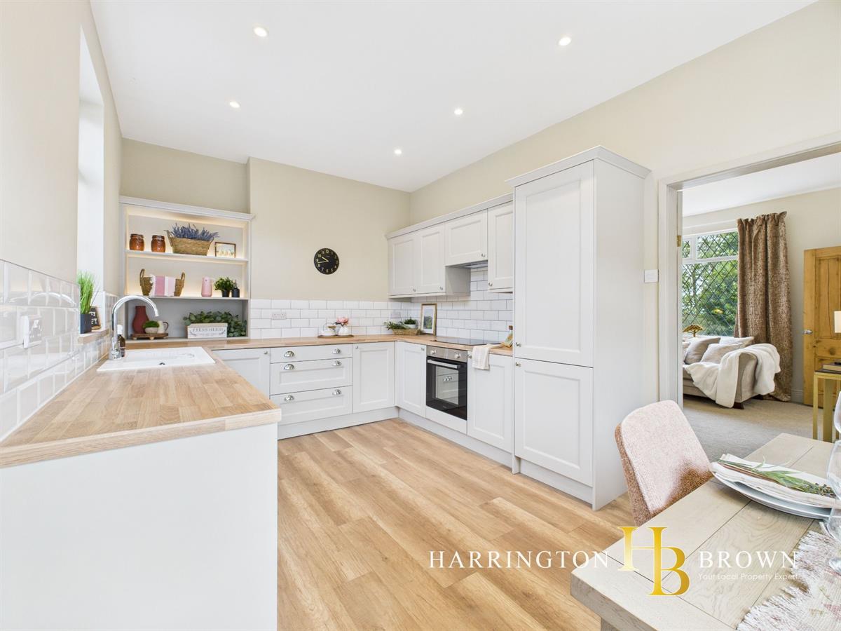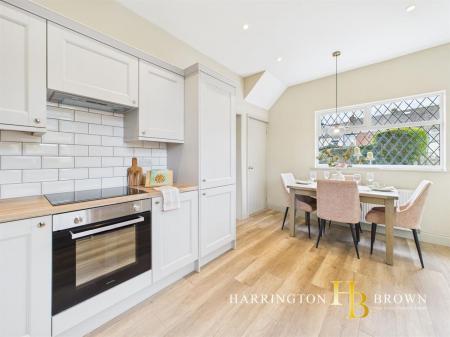 The property opens with an inviting entrance lobby, where the original staircase is enhanced by a classic banister, decorative dado rail and a stylish carpet runner that set the tone for the home's blend of character and contemporary design. To the front, the lounge is a welcoming retreat, featuring a focal point mantle, built-in alcove storage, wall lights and plush new carpets. To the rear, a large kitchen diner provides the heart of the home, with shaker-style wall and base units, a ceramic sink, metro tile splashback, open shelving and laminate flooring creating a light and practical space for everyday living and entertaining. An understairs storage cupboard adds functionality, while a glazed door leads through to a thoughtfully designed lobby and ground-floor W.C, where statement panelling adds texture and interest.
