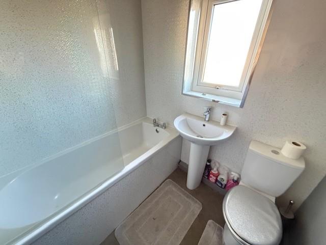 Bathroom - 1.87 x 1.73 (6'1" x 5'8") - Bath with boiler fed shower and glazed screen, WC, pedestal wash hand basin, laminate walls and Upvc window to rear aspect.