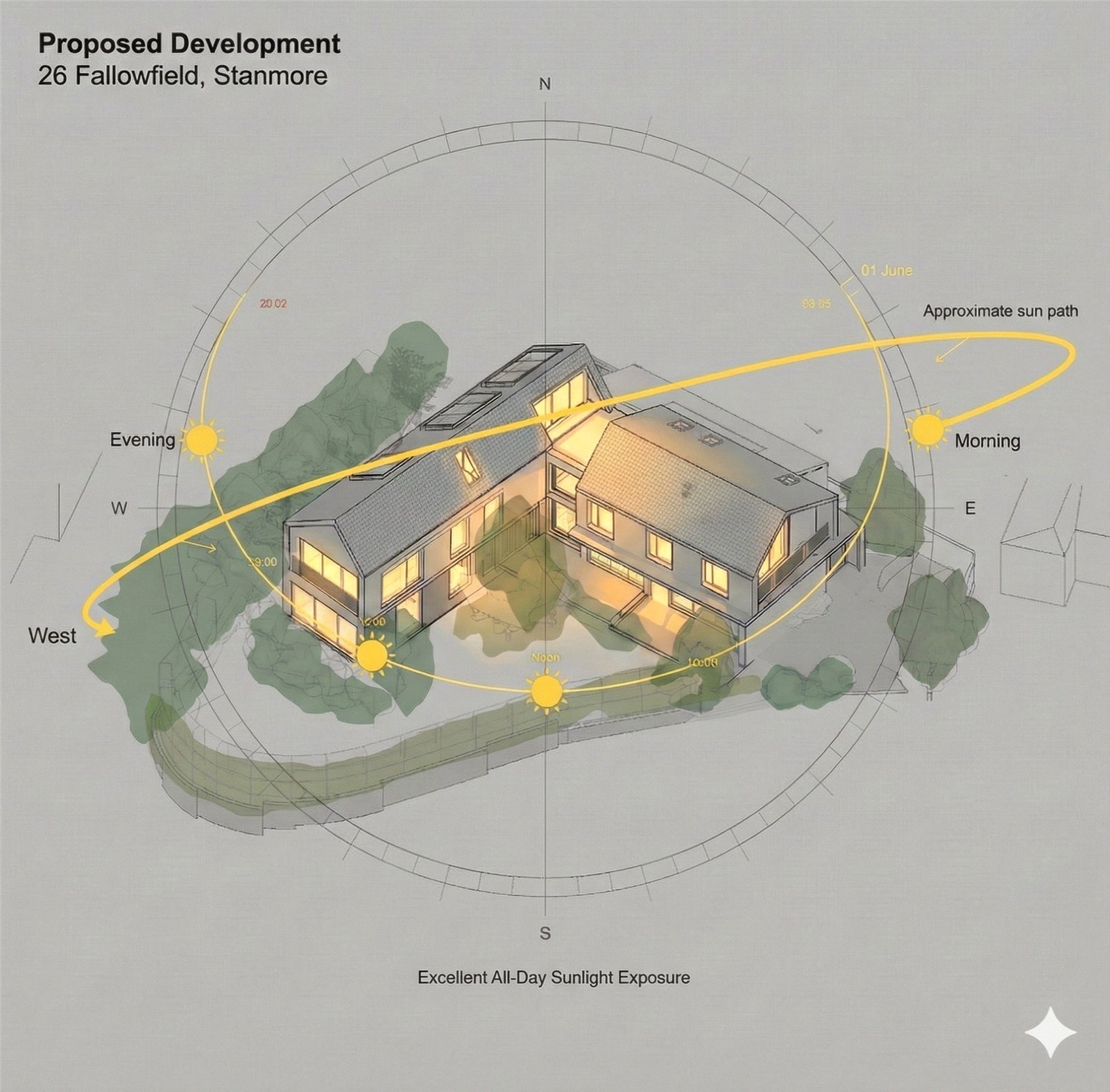 The property enjoys a truly unique position, having been selected by the original owners in 1950 as the first pick of all the plots on the road, specifically for its exceptional sunlight. The house benefits from sun throughout the entire day, rising in the east and setting in the west, with uninterrupted light flowing across the full span of the garden directly into the house. The approved design delivers a substantial contemporary family home featuring 7 bedroom suites.
