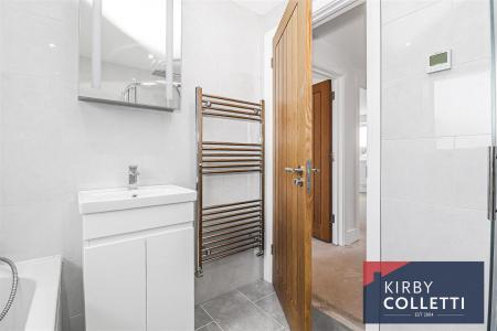 Family Bath/Shower Room - 2.24m'' x 2.01m'' (7'4'' x 6'7'') - Rear aspect uPVC double glazed window. White suite comprising panel enclosed bath with mixer tap and shower attachment over. Wash hand basin with cupboard below. Fully tiled shower cubicle. Low level W.C. Fully tiled walls. Heated towel rail. Recessed spotlights. Tiled floor.