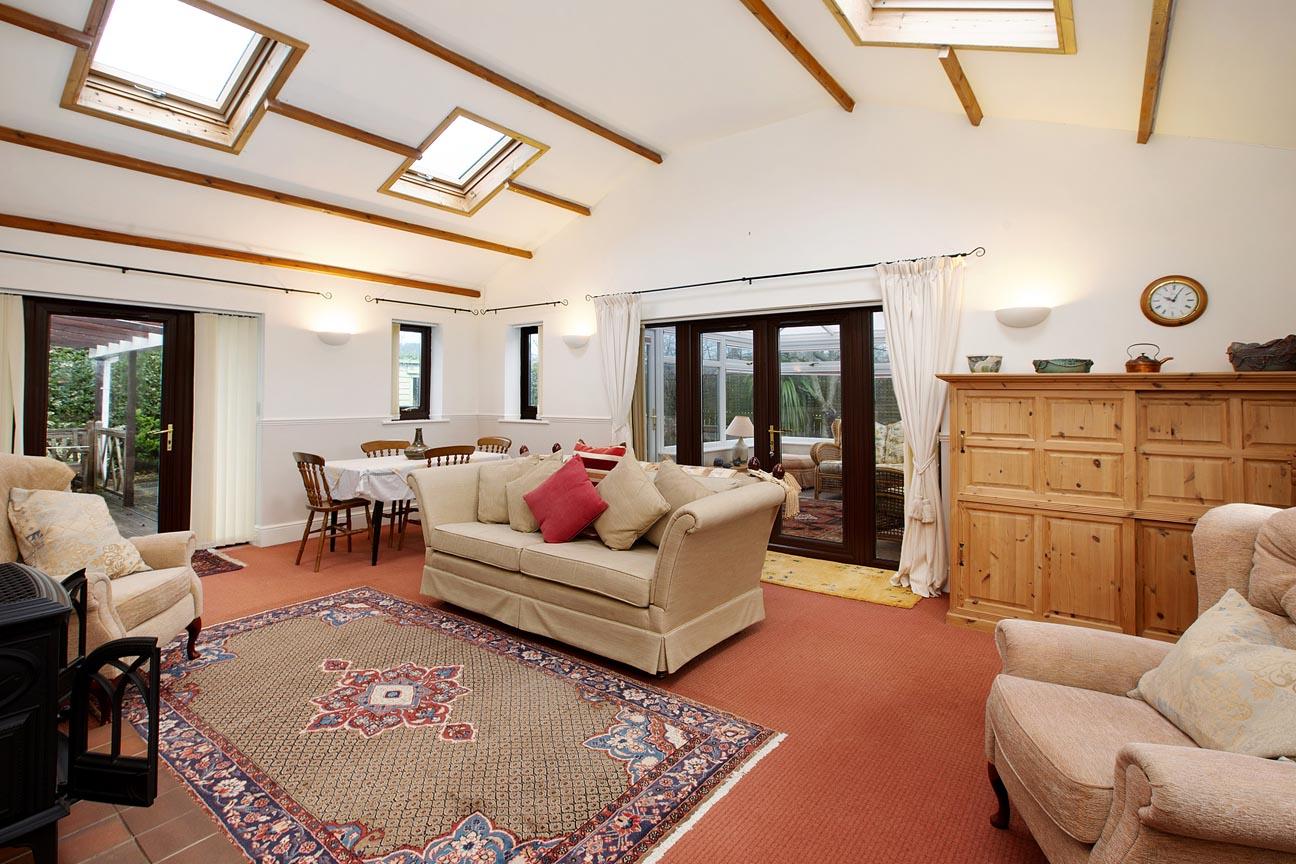 FAMILY ROOM: A particularly impressive room with vaulted ceiling and rooflights, creating a bright and airy atmosphere. Door opening onto the rear deck and garden, feature gas fire, making this an ideal entertaining or family space. French doors into: