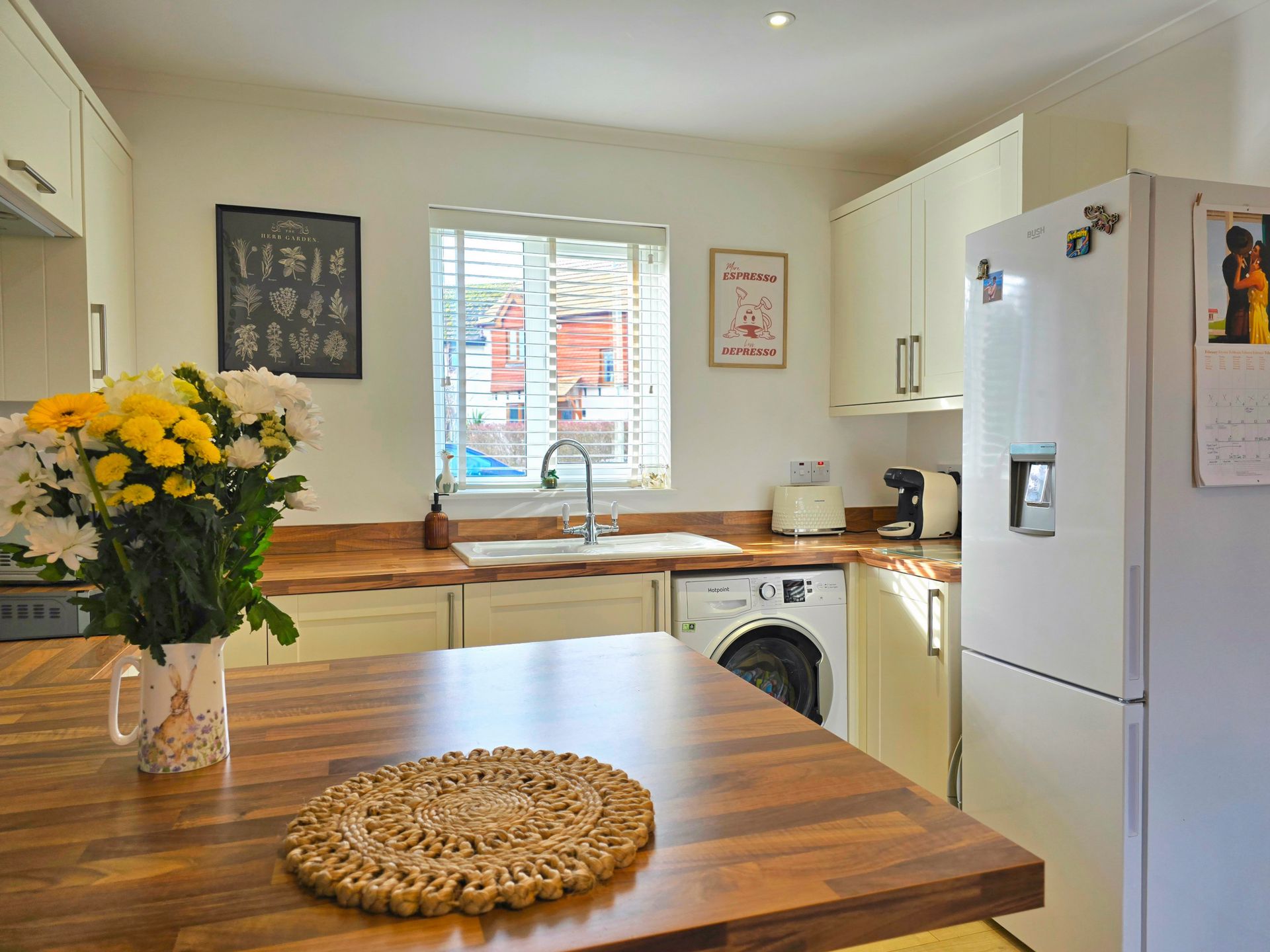 KITCHEN AREA: The shaker style kitchen comprises matching eye level and base units with wood effect work surfaces over with inset sink/drainer and mixer taps. Integrated appliances include electric oven, induction hob with extractor over. There is space and plumbing for a washing machine and fridge/freezer. A uPVC double glazed window overlooks the front garden.