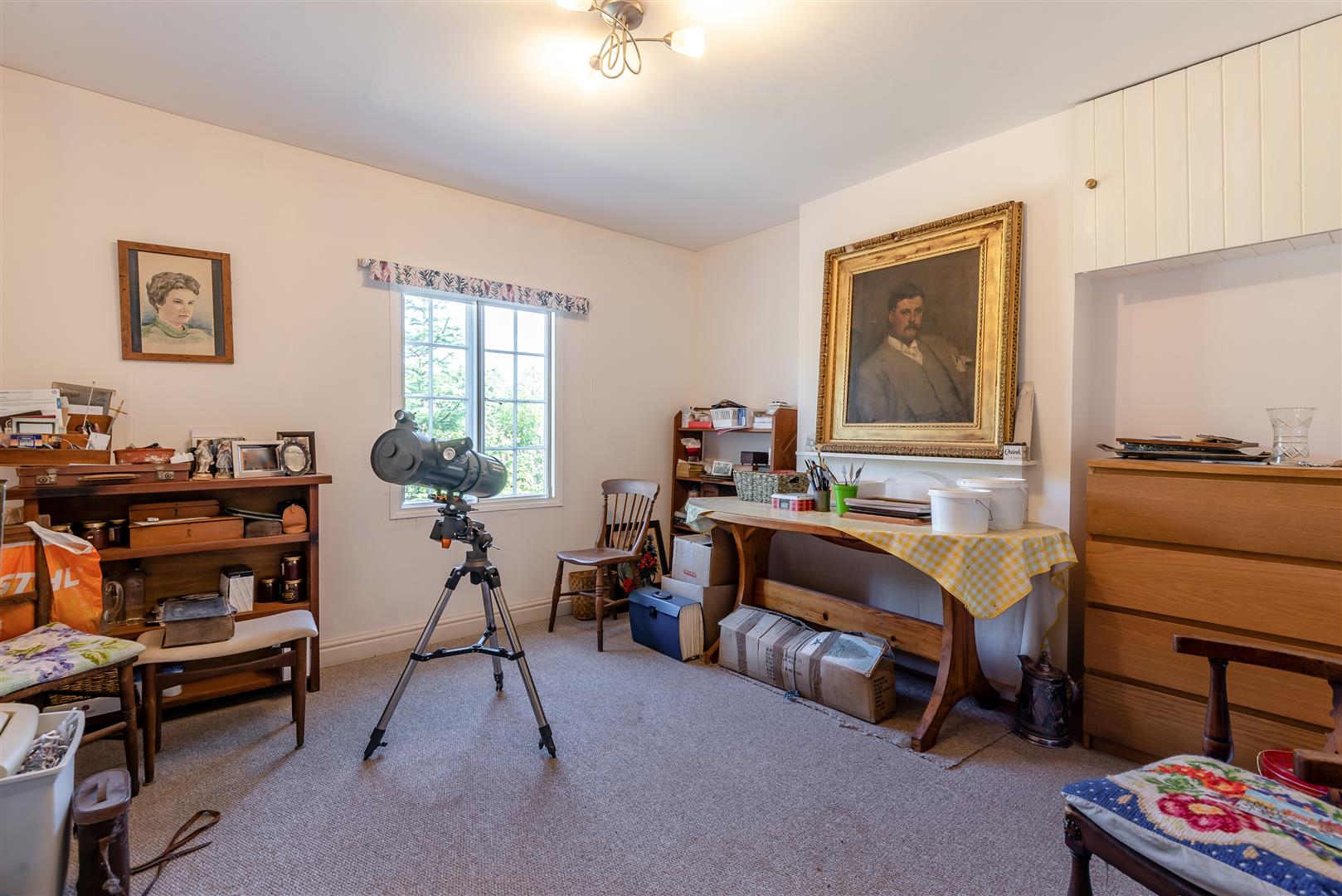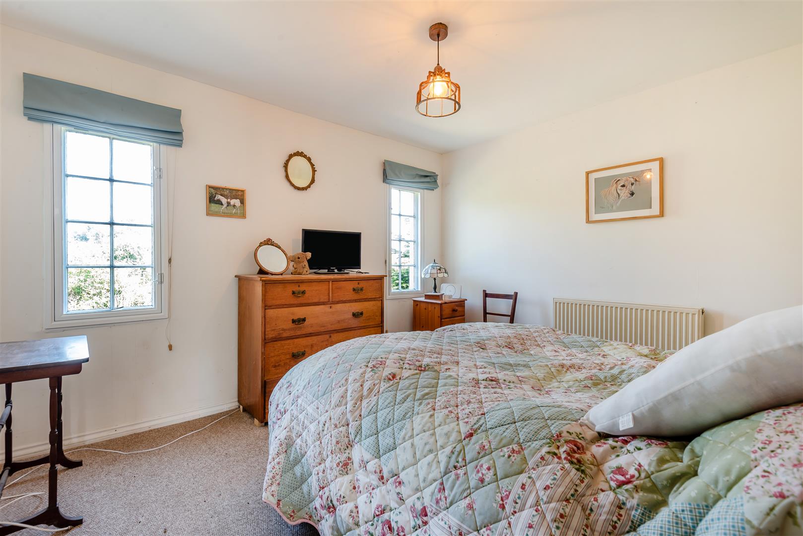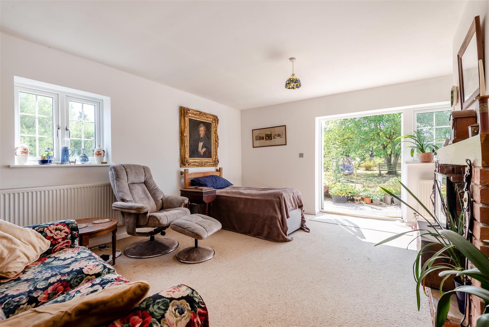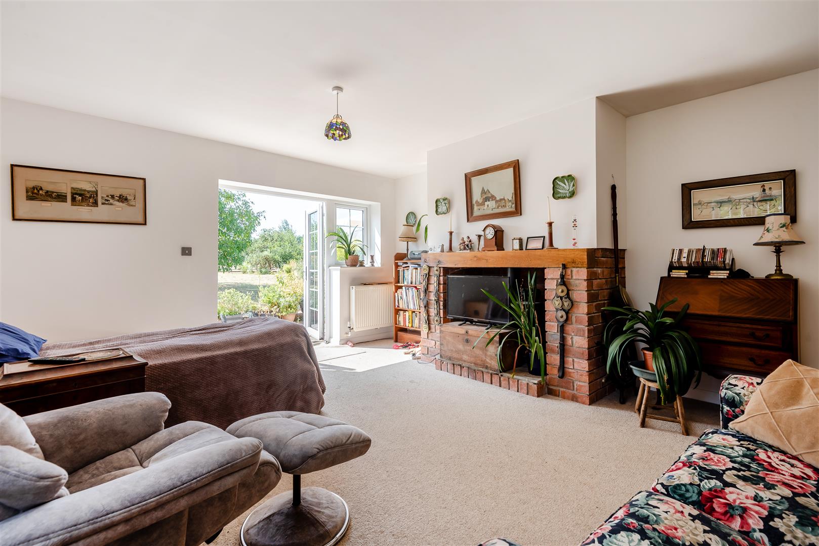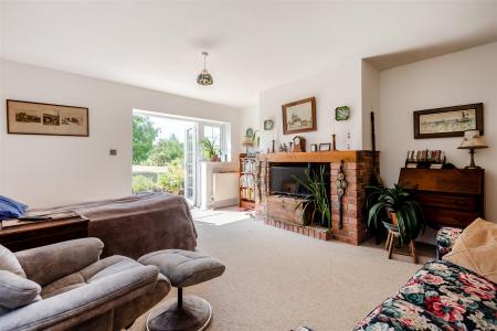 Lounge - 5.99m x 4.32m (19'8 x 14'2) - Brick fireplace with inset wood burning stove, solid wood beam over, two double radiators, large walk-in cupboard with shelving (could easily be a walk-in wardrobe for bedroom 3), side and rear aspect windows, fully glazed French doors through to the rear garden with a lovely outlook over the gardens and ground.