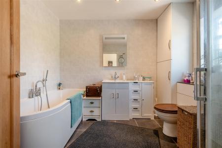 Bathroom - 2.92m x 2.46m (9'7 x 8'1) - White suite with modern panelled bath, tiled surround, separate double shower cubicle and tray, shower, tiled surround, close coupled WC, vanity wash hand basin, cupboards below, tiled splashback, mirror over, built-in cupboards, tiled flooring, double radiator, side aspect frosted window.