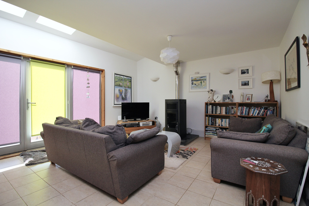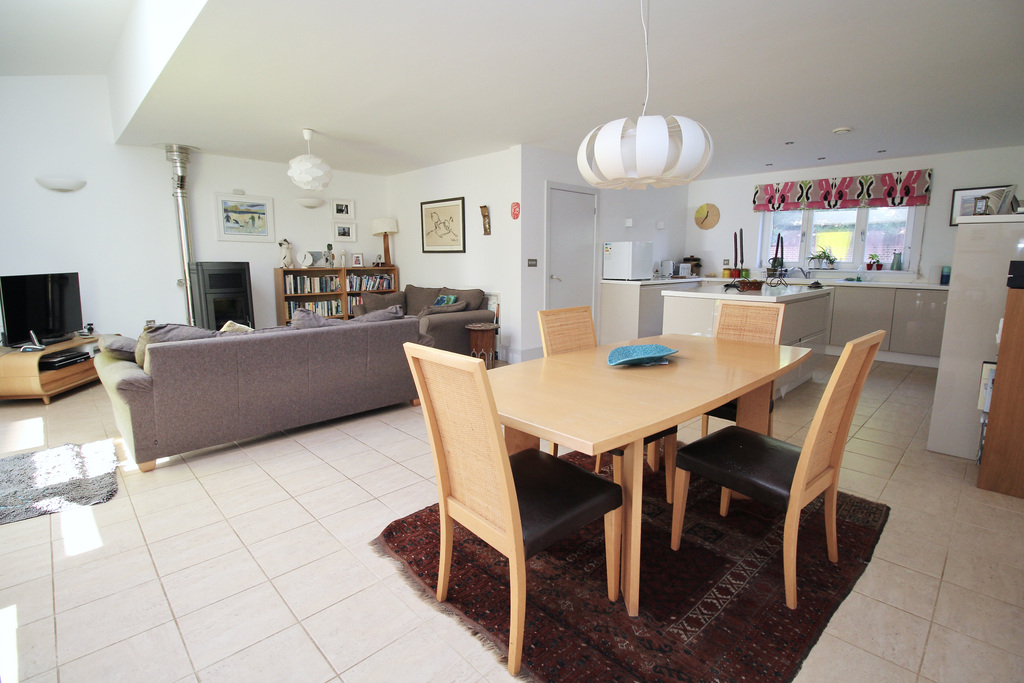 - A bright and spacious open-plan living area combining lounge, dining and kitchen spaces, flooded with natural light from Velux windows and French doors, ideal for modern living and entertaining.