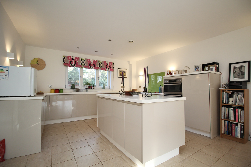 - Modern fitted kitchen featuring a range of base and drawer units with central island, complemented by integrated appliances including oven, hob, washing machine and fridge/freezer.