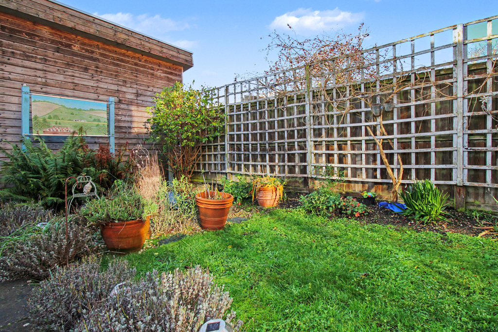 - Enjoying a low-maintenance, south-facing garden featuring gravelled areas, a lawn edge with mature shrubs and a designated seating area ideal for outdoor relaxation.