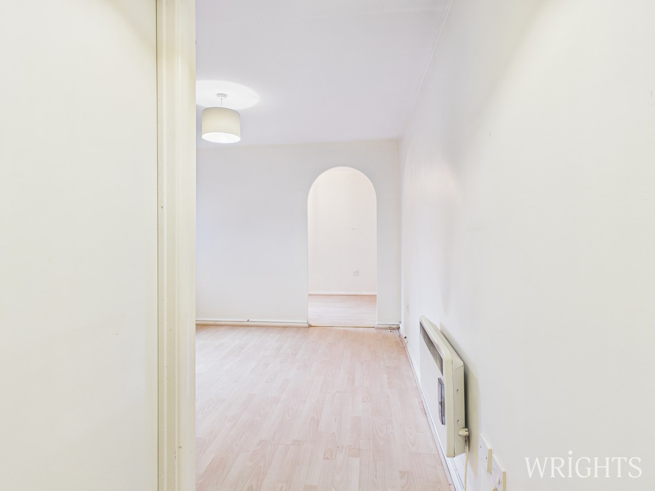 3.13m x 3.19m (10' 3" x 10' 6") Via hardwood entrance door, laminate wood flooring, wall mounted electric heater, side aspect double glazed window, doors leading to kitchen and bathroom, archway to: