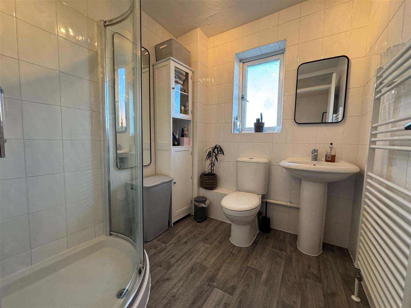 Re- Fitted Shower Room - A fitted shower cubicle with mixer tap, shower hose/ attachment, tray and shower door and screen, low level WC, pedestal hand wash basin with mixer tap, fully tiled walls, laminate flooring, heated towel rail.