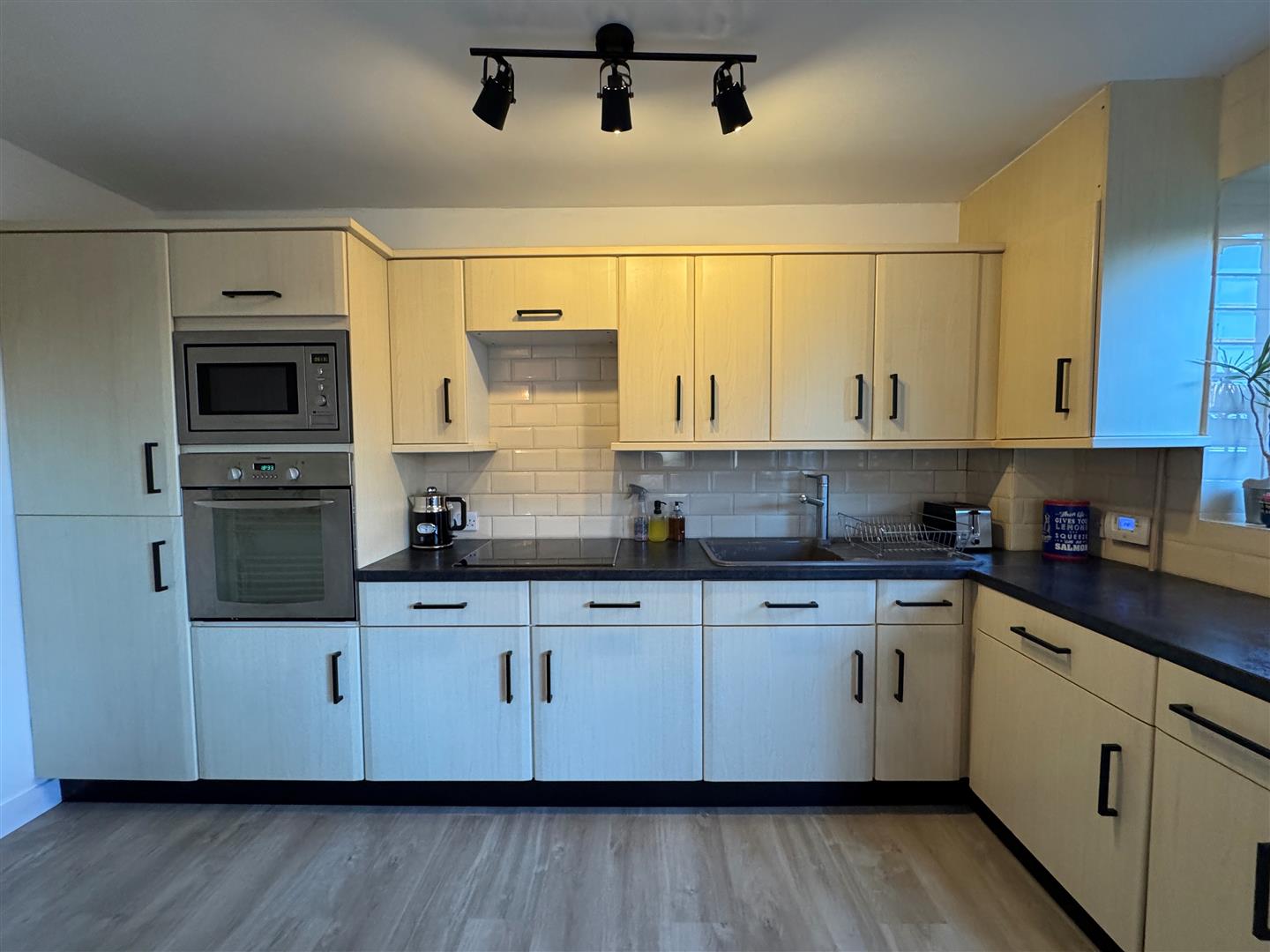 Re-Fitted Kitchen - Double glazed window to rear garden, a re-fitted kitchen with granite effect work top surfaces, wall and base units with fitted drawers with large steel handles, dark resin sink unit with drainer and bowl and mixer tap, integrated 'Indesit' oven and microwave, integrated fridge and freezer, integrated 'Indesit' washing machine, wall mounted boiler enclosed in matching door, panelled radiator, ceiling spotlights.