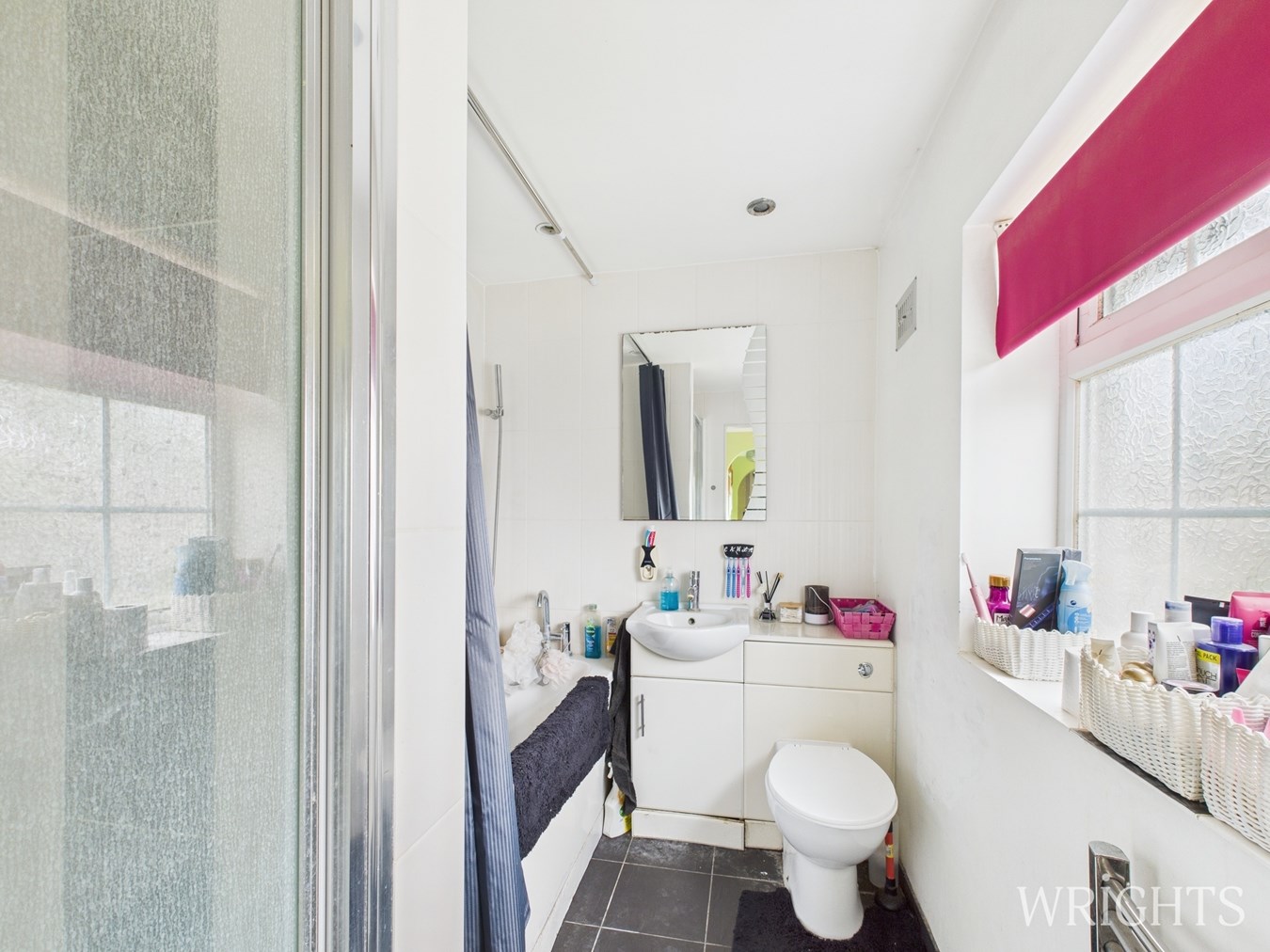 Rear aspect double glazed multi pane effect frosted glass window. Four piece bathroom suite comprising off panel enclosed bath with hand held shower attachment, wash hand basin with vanity unit below, low flush WC, independent shower cubicle, heated towel rail, tiled flooring, downlighters to ceiling.