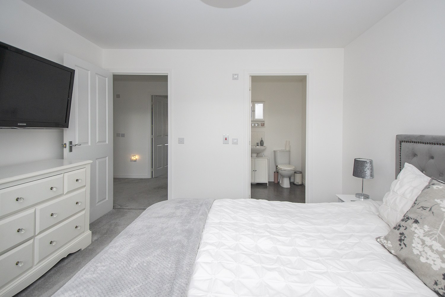 Access from the master bedroom the en-suite houses a 3 piece suite comprising wc, wash hand basin with pedestal and shower cubicle with thermostatic shower. Tiled splash-back areas. Vinyl flooring. Side facing opaque window.