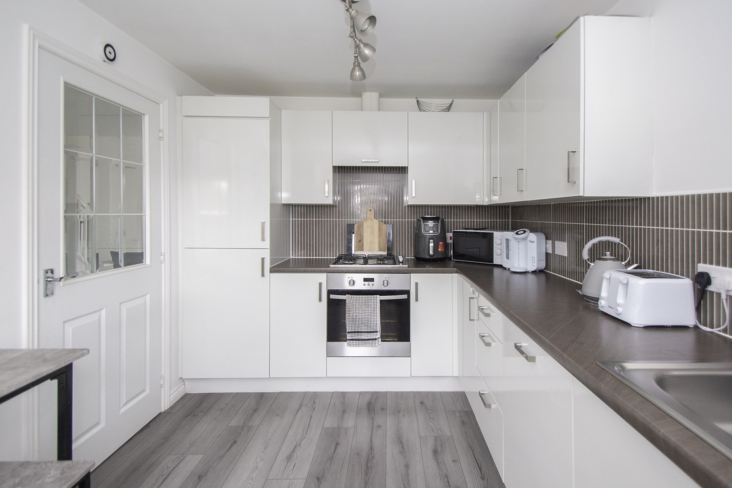 Quality fitted kitchen with an ample range of base and wall units in modern wood effect with complimentary worktops and tiled splashback area. The kitchen benefits from inset stainless steel sink with mixer tap and integrated appliances gas hob, electric oven and hood, fridge freezer, dishwasher and washing machine. Modern décor with vinyl. Door giving access to rear gardens. Ample power points.