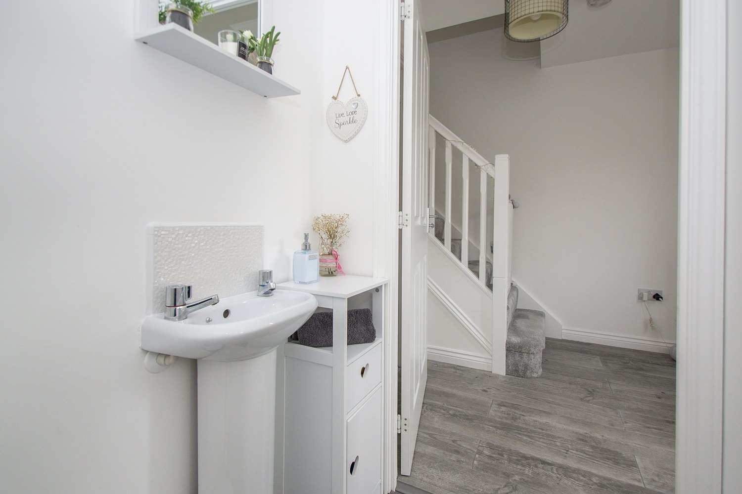 Entered from the entrance hall the cloakroom has a 2 piece suite comprising wc and wash hand basin. Vinyl flooring. Front facing opaque window.