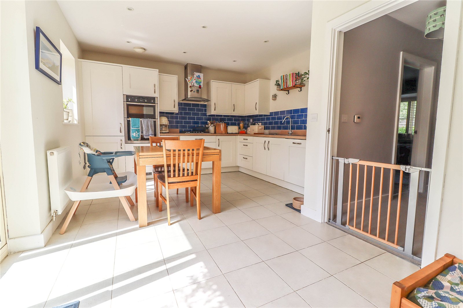 Kitchen / Dining Room Spacious, light and airy. Stainless steel 1? bowl sink unit with mixer tap and drainer. Roll top oak effect work surfaces with similar upstand and metro tiled splashbacks. A range of cream high and low level cupboards and drawers, incorporating deep pan drawers. Eye level Neff double oven and grill. Four ring Neff gas hob with curved glass/stainless steel hood above with extractor fan and light. Integrated fridge and freezer. Integrated dishwasher. Ceramic tiled flooring throughout with space for a large dining/entertaining table, pendant light point over. Further LED downlighters. Sliding glazed door with similar glazed panel to side opening on to the rear patio and garden. Further high window overlooking the rear garden. Panelled door into a substantial attached garage/workshop which incorporates a utility area.