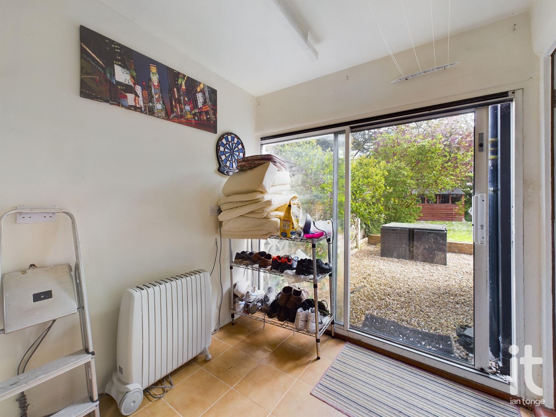 Sliding patio doors leading to rear garden, tiled floor, radiator, access to garage.