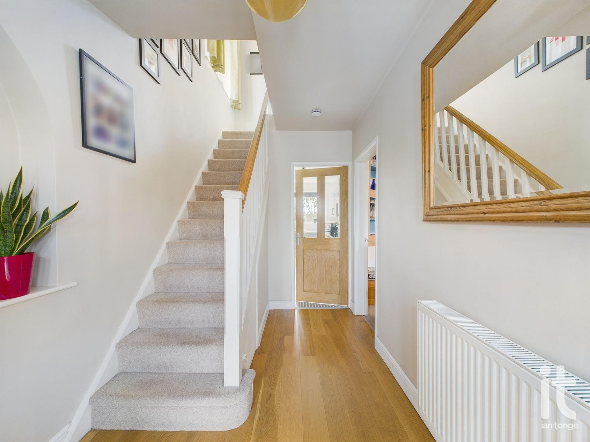 Composite entrance door, wooden flooring, radiator, meter cupboard, stairs leading to first floor.