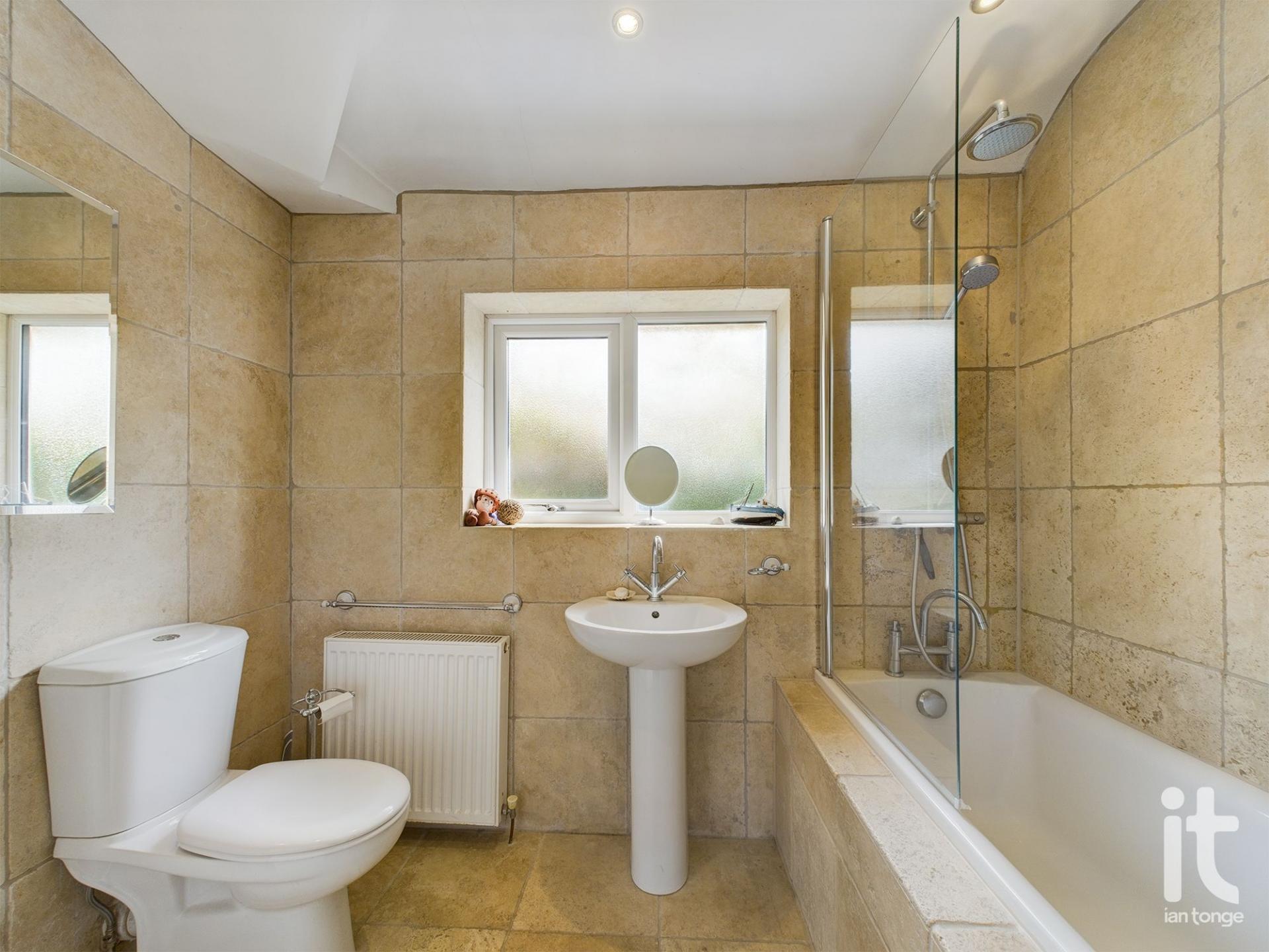 uPVC double glazed window to rear aspect, Travertine tiling to floor and walls, tiled bath with glass screen and shower over, pedestal hand wash basin, low level W.C, chrome heated towel rail, radiator, ceiling downlighters.