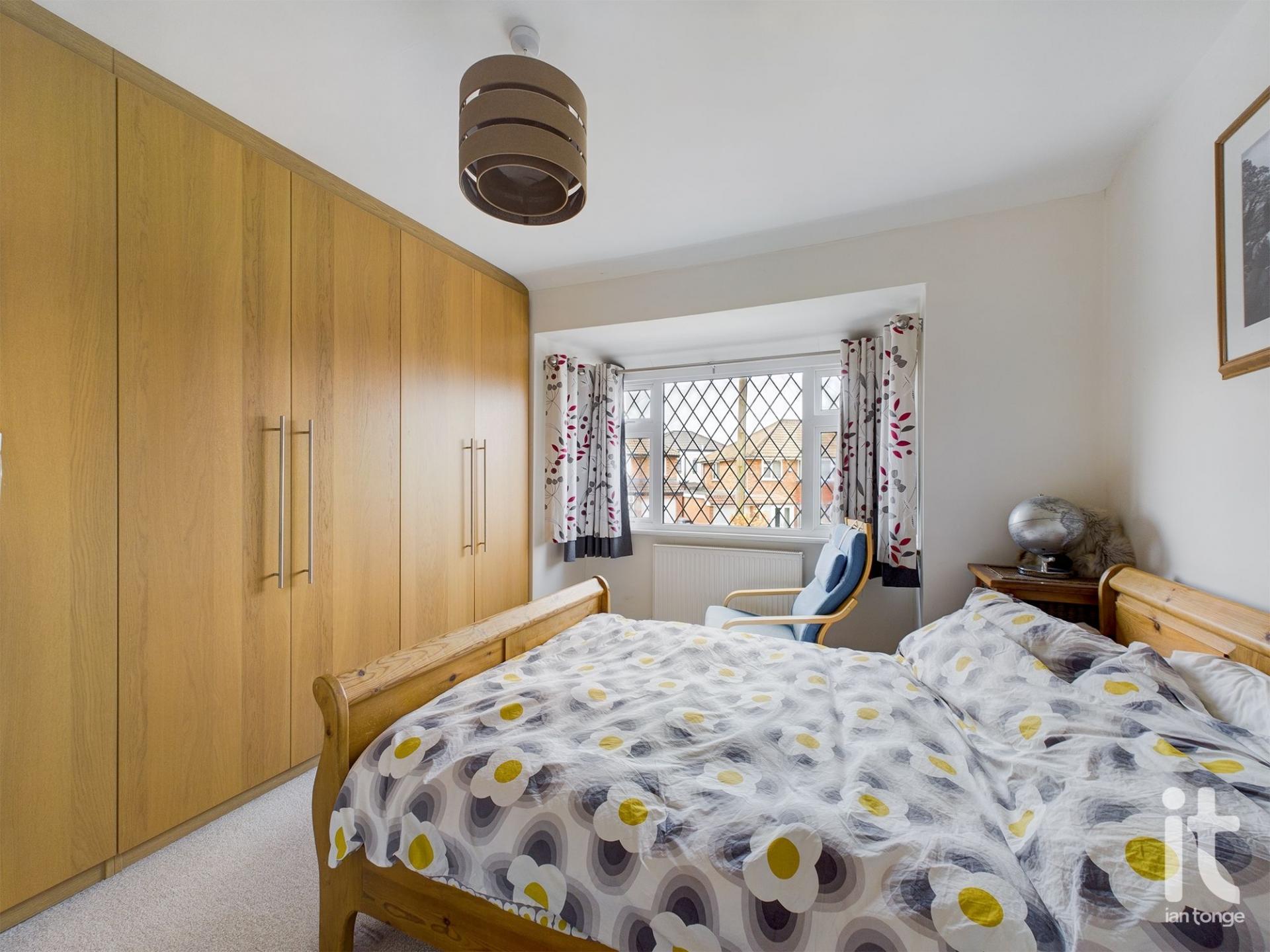 uPVC double glazed leaded bay window to front aspect, radiator, range of fitted wardrobes to one wall, power points.