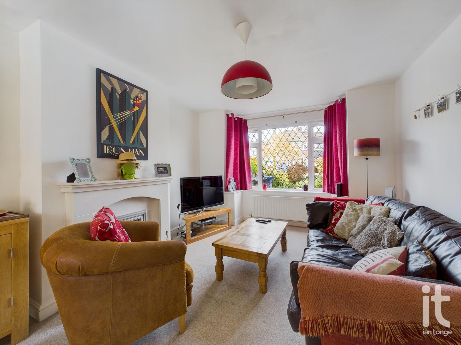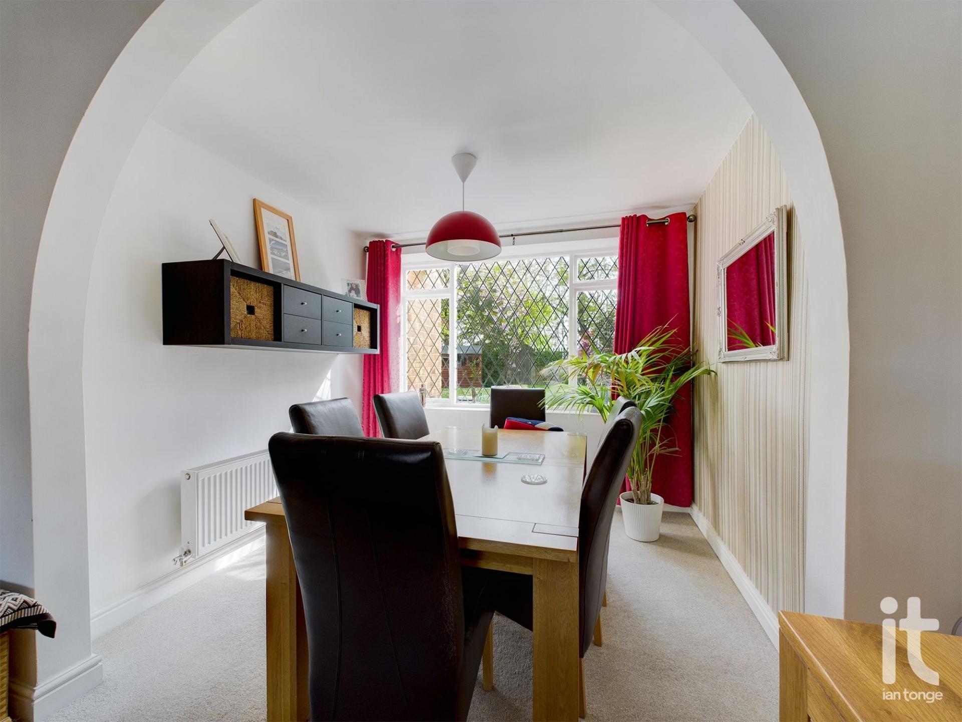 uPVC double glazed leaded bay window to front aspect, focal fireplace with electric fire, radiator, T.V. aerial, power points, arch leading through to dining room.