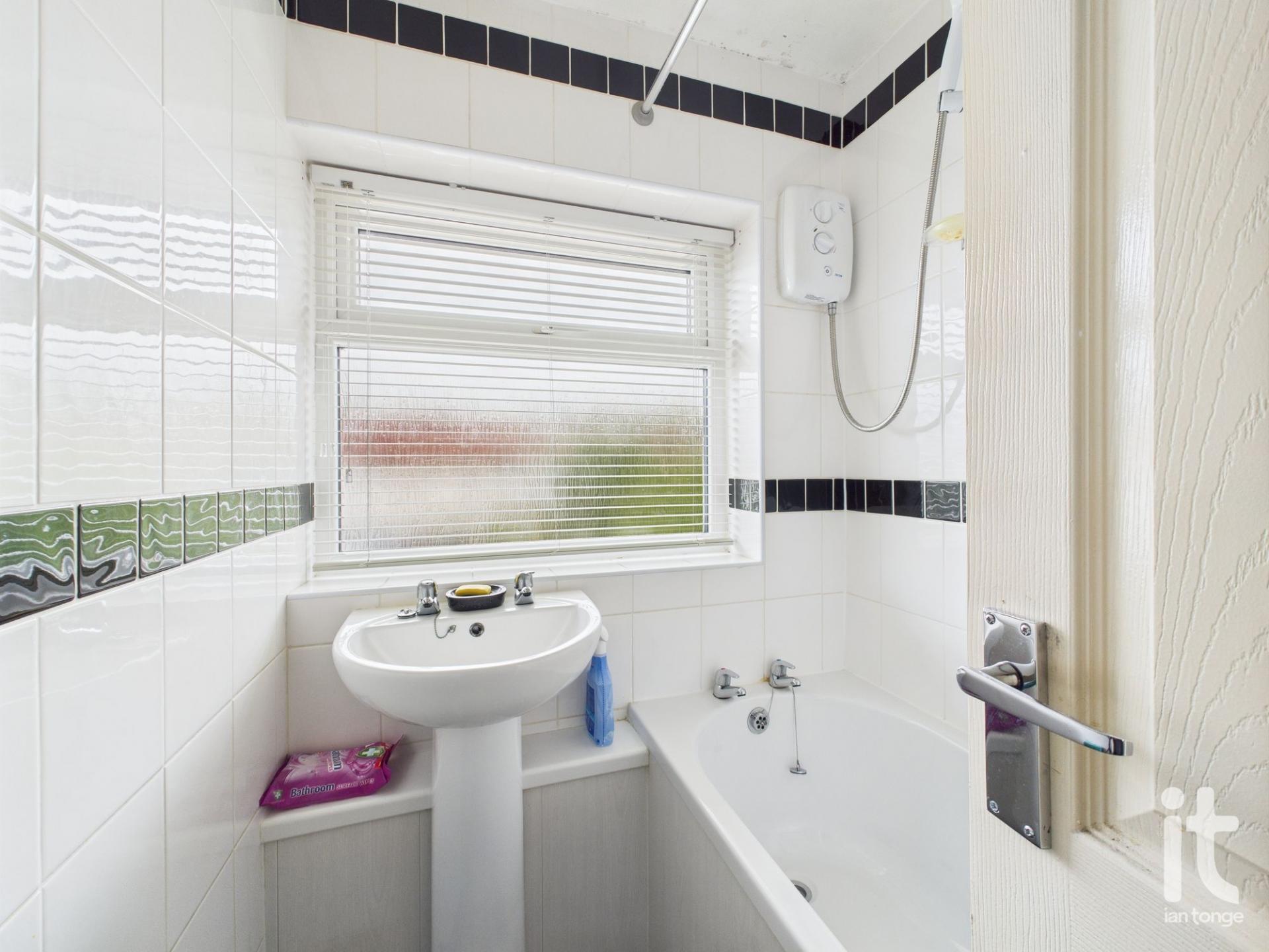 uPVC triple glazed window to the rear aspect, panel bath with Triton shower over, pedestal wash basin, tiled walls, radiator.