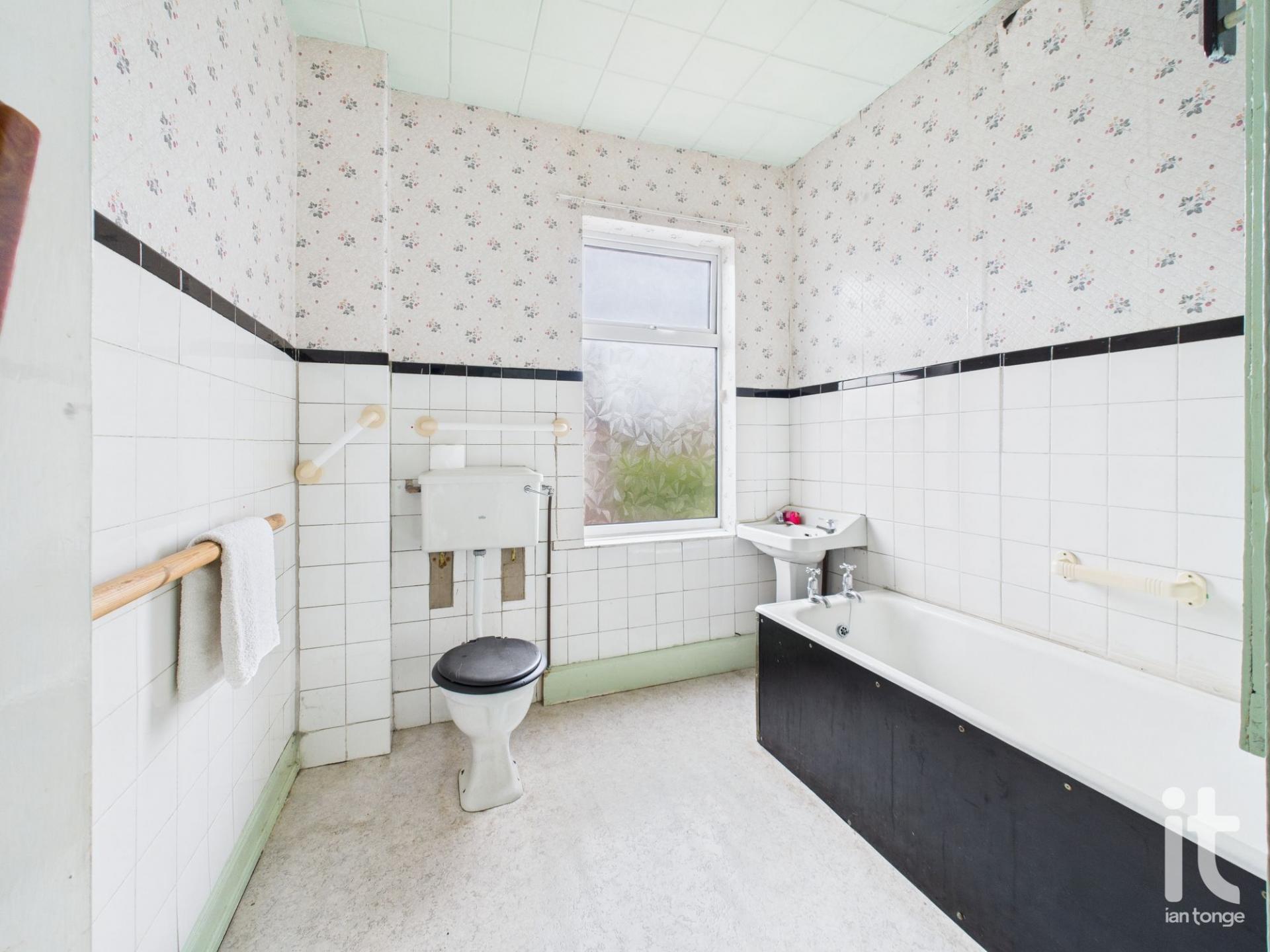 Double glazed window to the rear aspect, pedestal wash basin, low level W.C., enamel bath, part tiled walls.