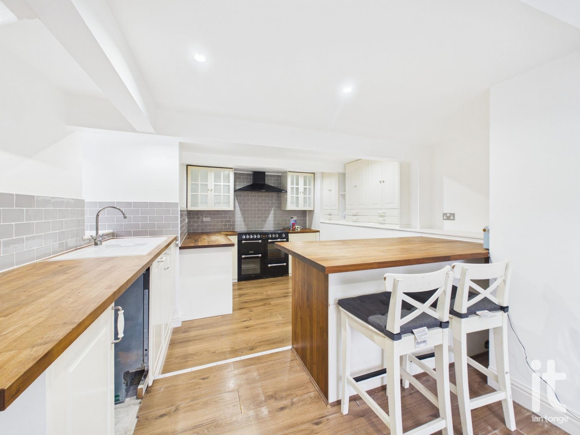 uPVC double glazed double doors leading to the garden, laminate flooring, range of fitted wall and base units, work surfaces, drainer sink unit, breakfast bar, range cooker, extractor hood, wine cooler, splash back wall tiles, radiator.