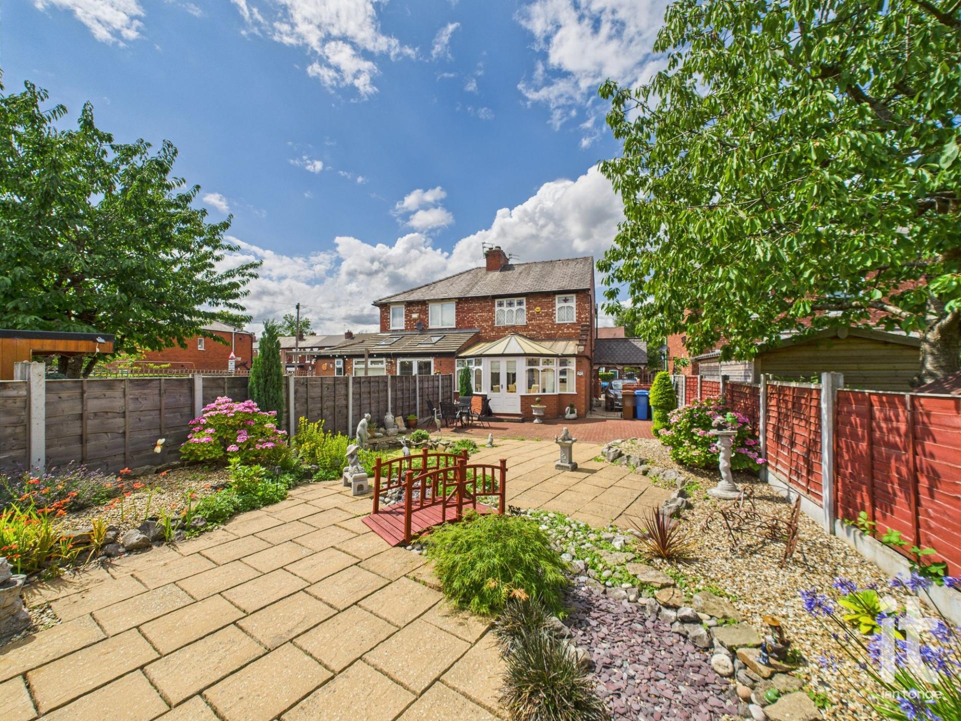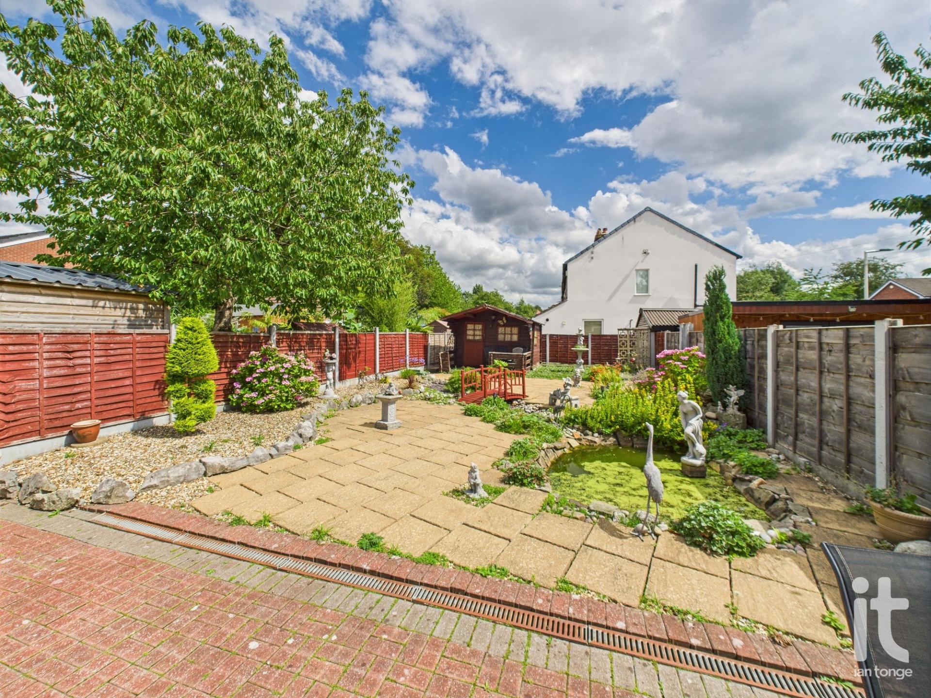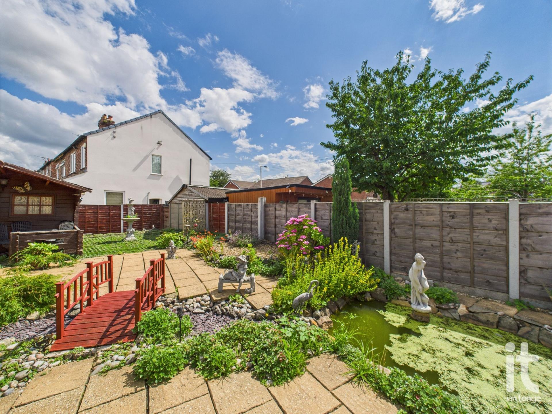 An attractive hardstanding landscaped rear garden with a good sized patio area, pond and planting with timber summer house to the rear. The front has two sets of secure wrought iron gates and an ample driveway for parking for more than one vehicle.
