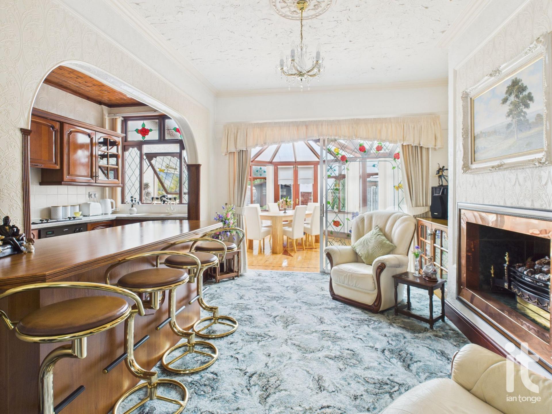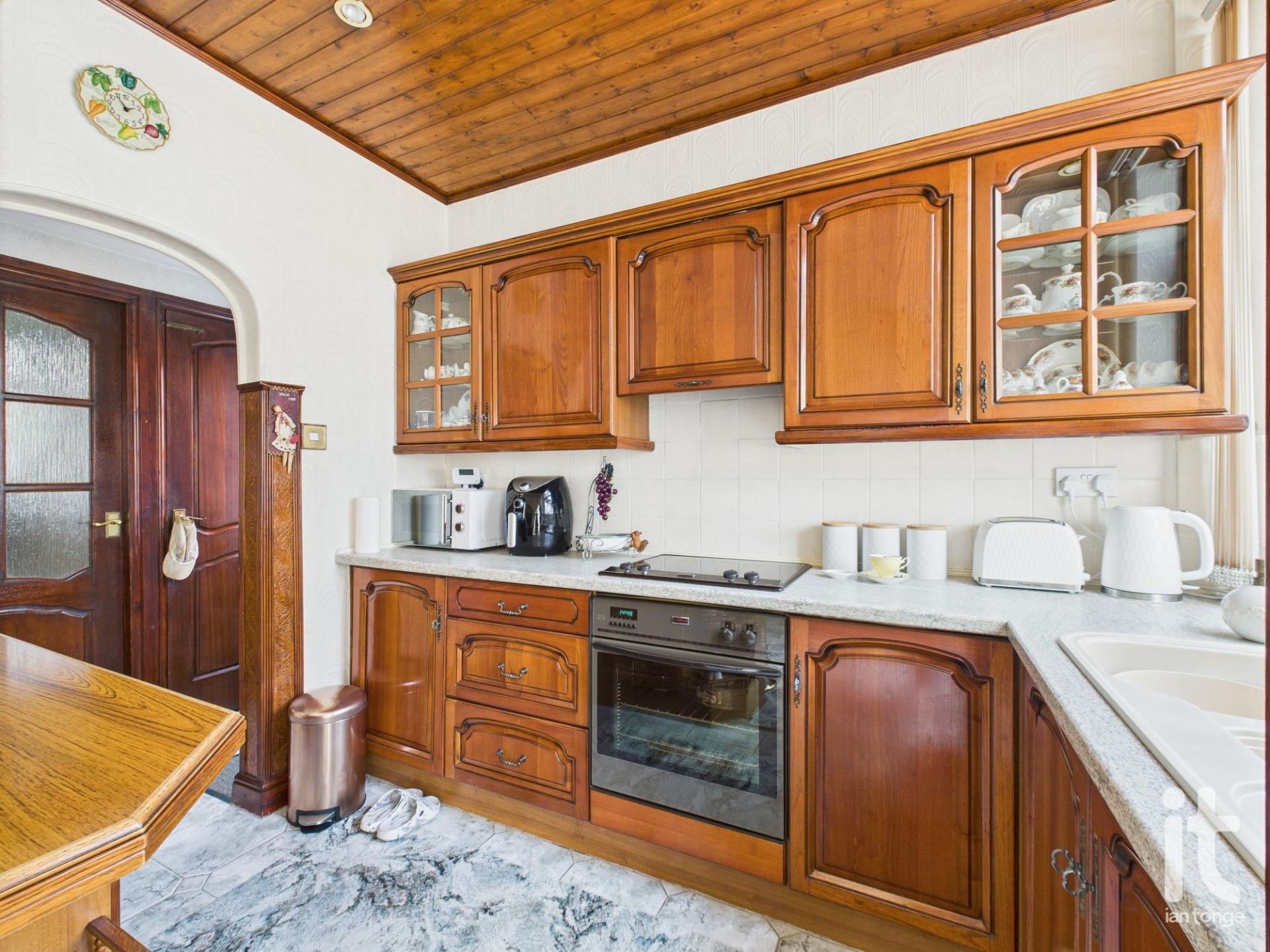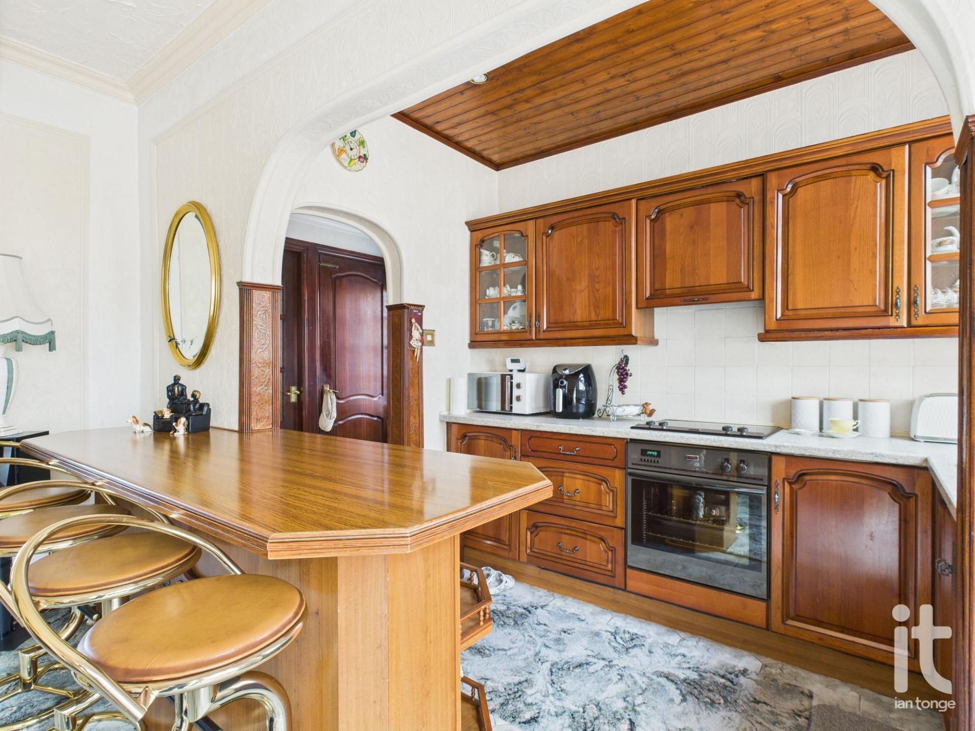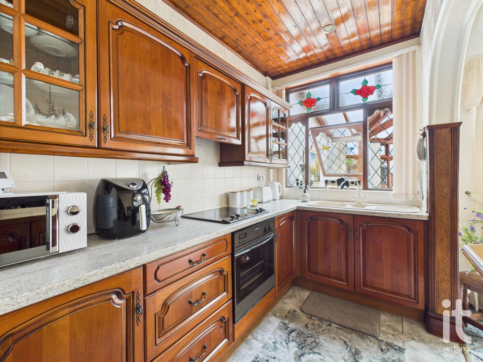 Range of fitted wall and base units with worksurfaces incorporating sink, electric oven and hob with extractor over, breakfast bar. The dining area, second living room also features a fireplace and gives access to the large conservatory.