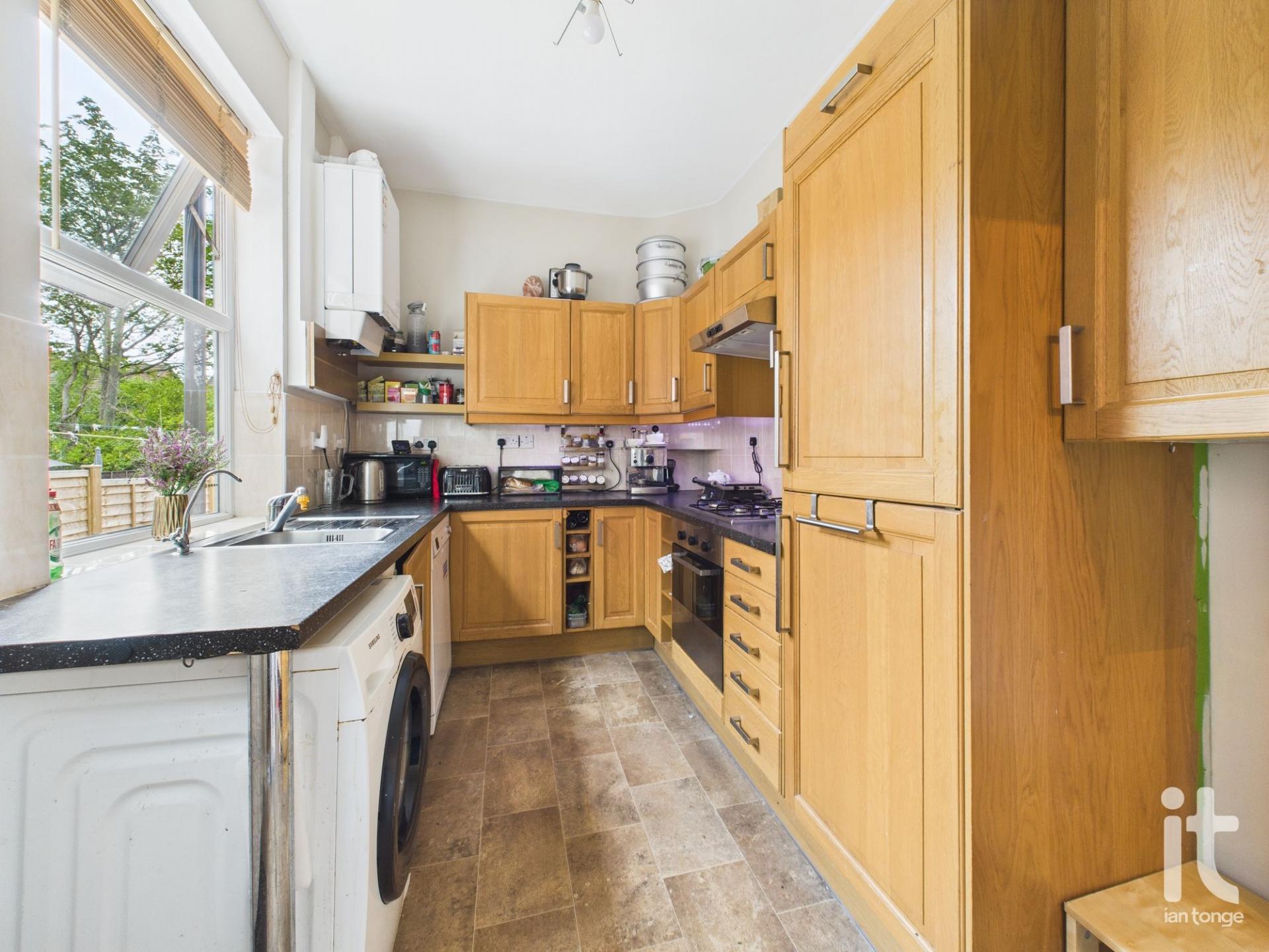 uPVC double glazed window to side aspect, range of fitted wall and base units with worksurfaces incorporating stainless steel sink and drainer. Built-in electric oven and gas hob with extractor canopy over, integrated dishwasher, fridge and freezer, plumbing for washing machine. Splashback tiling, wall mounted gas central heating boiler, radiator, vinyl flooring, power points.