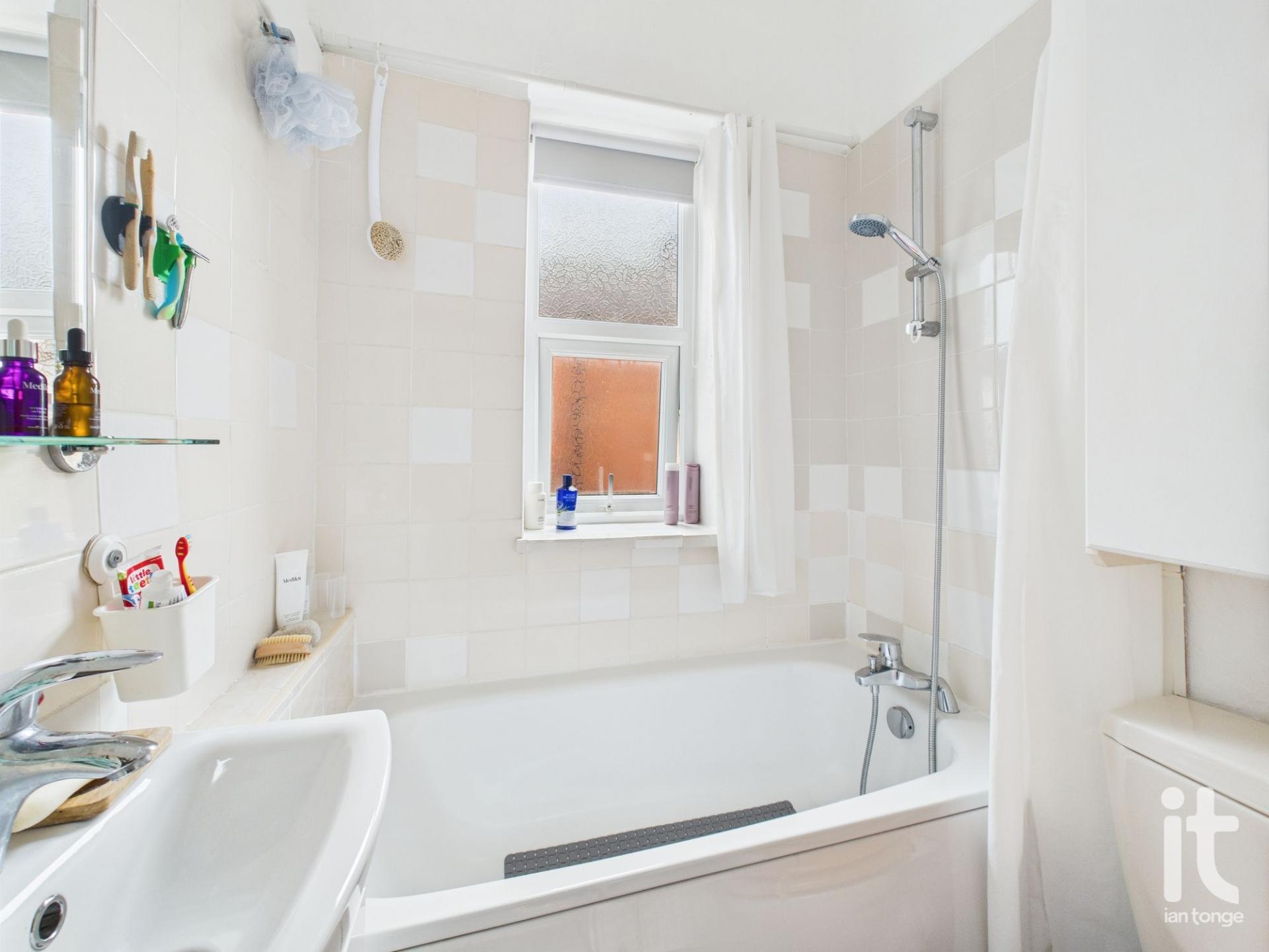 uPVC double glazed window to side aspect, fitted suite comprising of:- panelled bath with chrome shower over, pedestal hand wash basin, low level W.C. Part tiled walls, radiator, vinyl flooring.