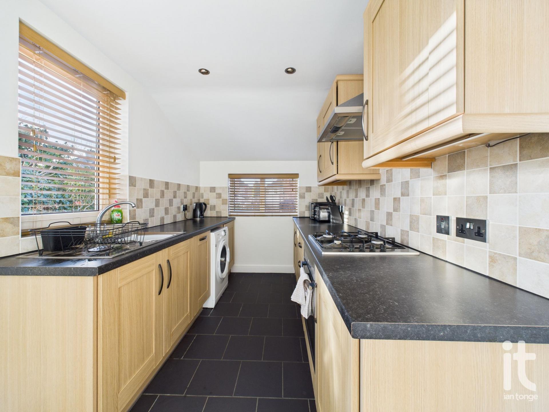 uPVC double glazed window to the rear and side aspect, range of fitted wall and base units, work surfaces with inset stainless steel drainer, built-in electric oven, four ring gas hob with extractor hood above, splash back wall tiles, tiled floor, uPVC rear door, ceiling downlighters, plumbed for washing machine, integrated fridge/freezer, dishwasher, radiator.