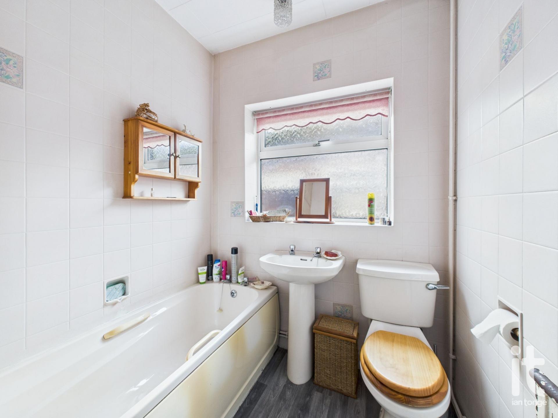 uPVC double glazed window to the side aspect, panel bath, pedestal wash basin, low level W.C., radiator, tiled walls, Vokera central heating boiler.