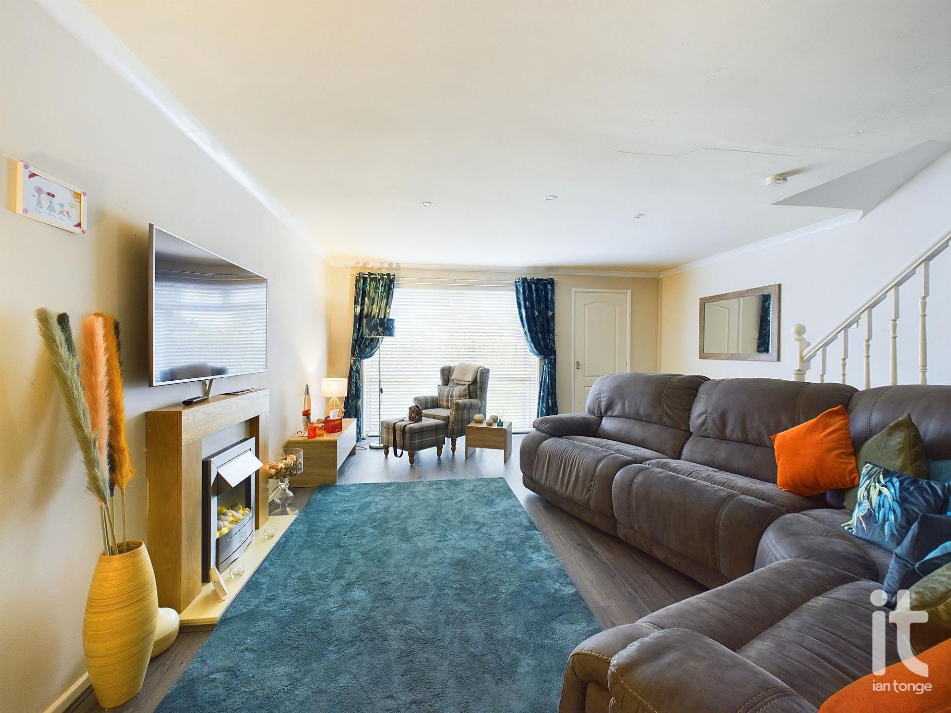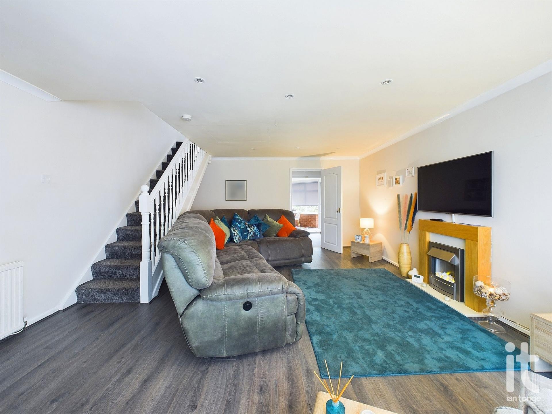 Floor to ceiling uPVC double glazed window, fireplace with gas fire, laminate flooring, two radiators, ceiling light, stairs up to first floor and door into kitchen.