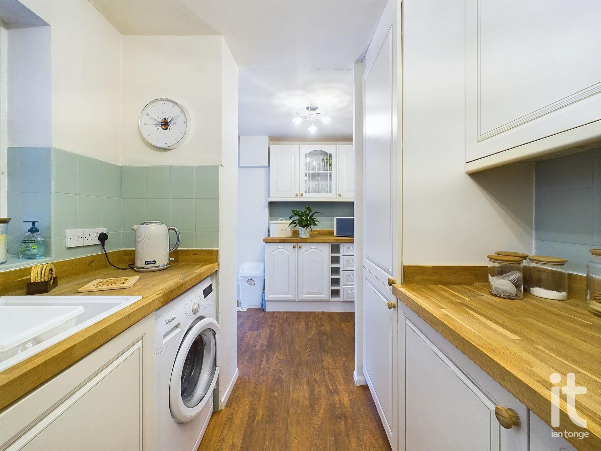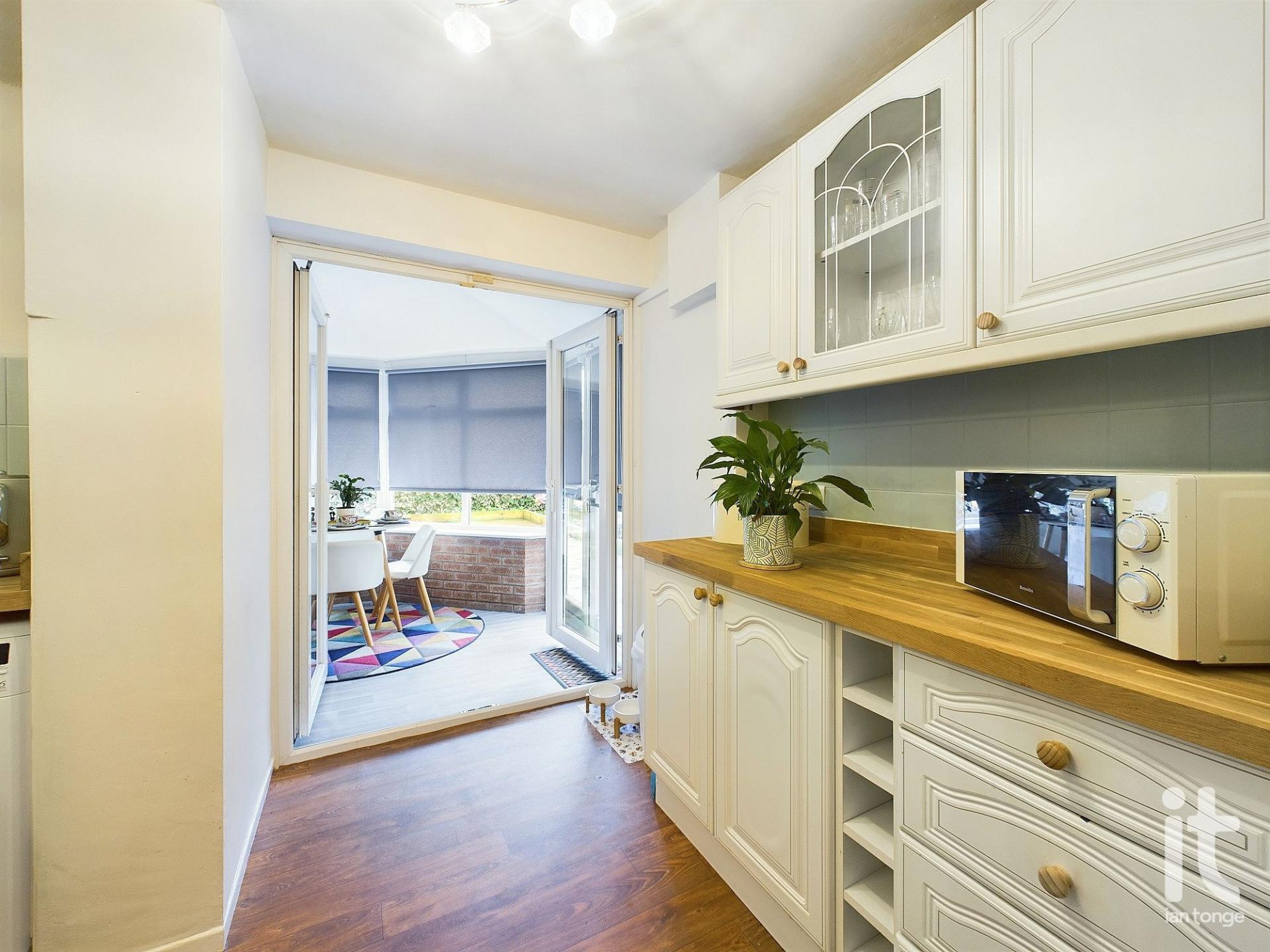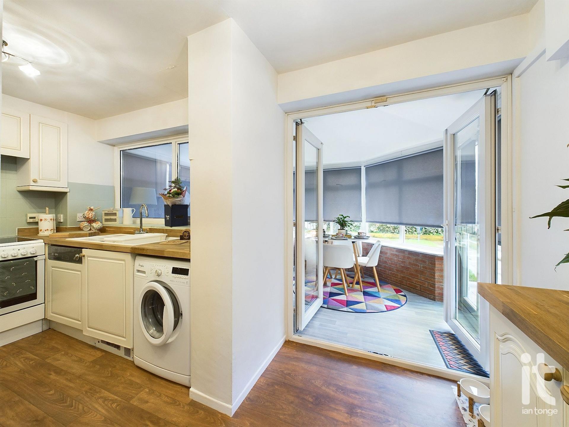 Wall and base units with butchers block worktop, sink, drainer and tap, dishwasher, oven with electric hob and fridge/freezer. Extractor fan. Tiled backsplash, under cabinet lighting, uPVC double glazed window, vinyl flooring, radiator, ceiling light and double doors leading into sun room.