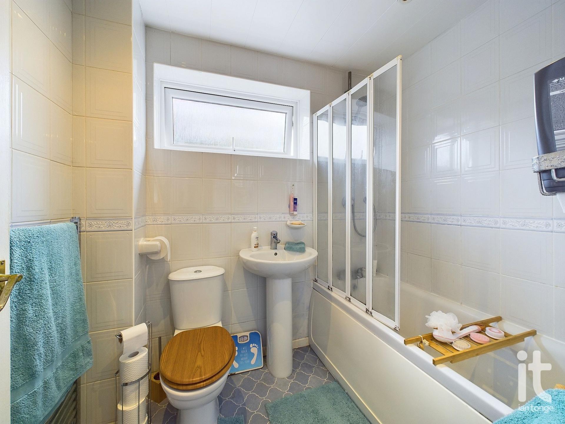 Shower over bath, sink with tap, toilet, towel radiator, fully tiled, vinyl flooring, downlights and uPVC double glazed window.