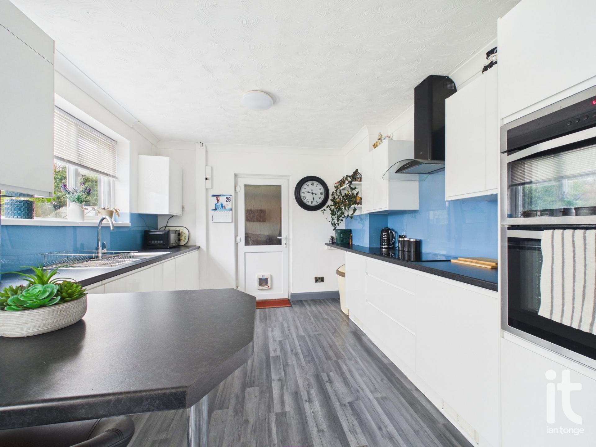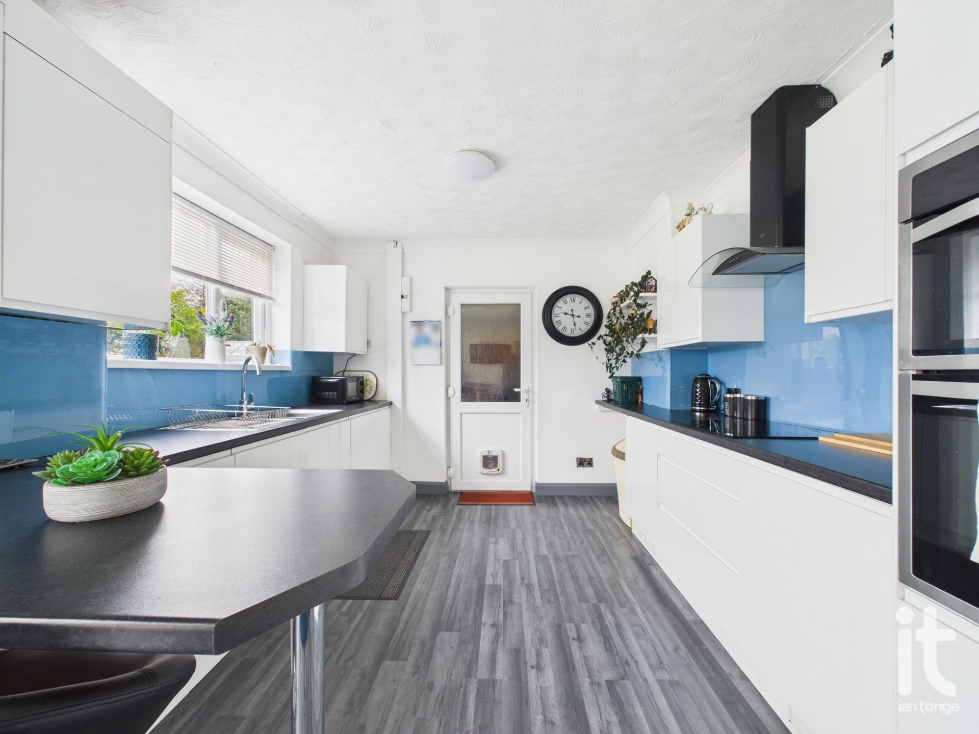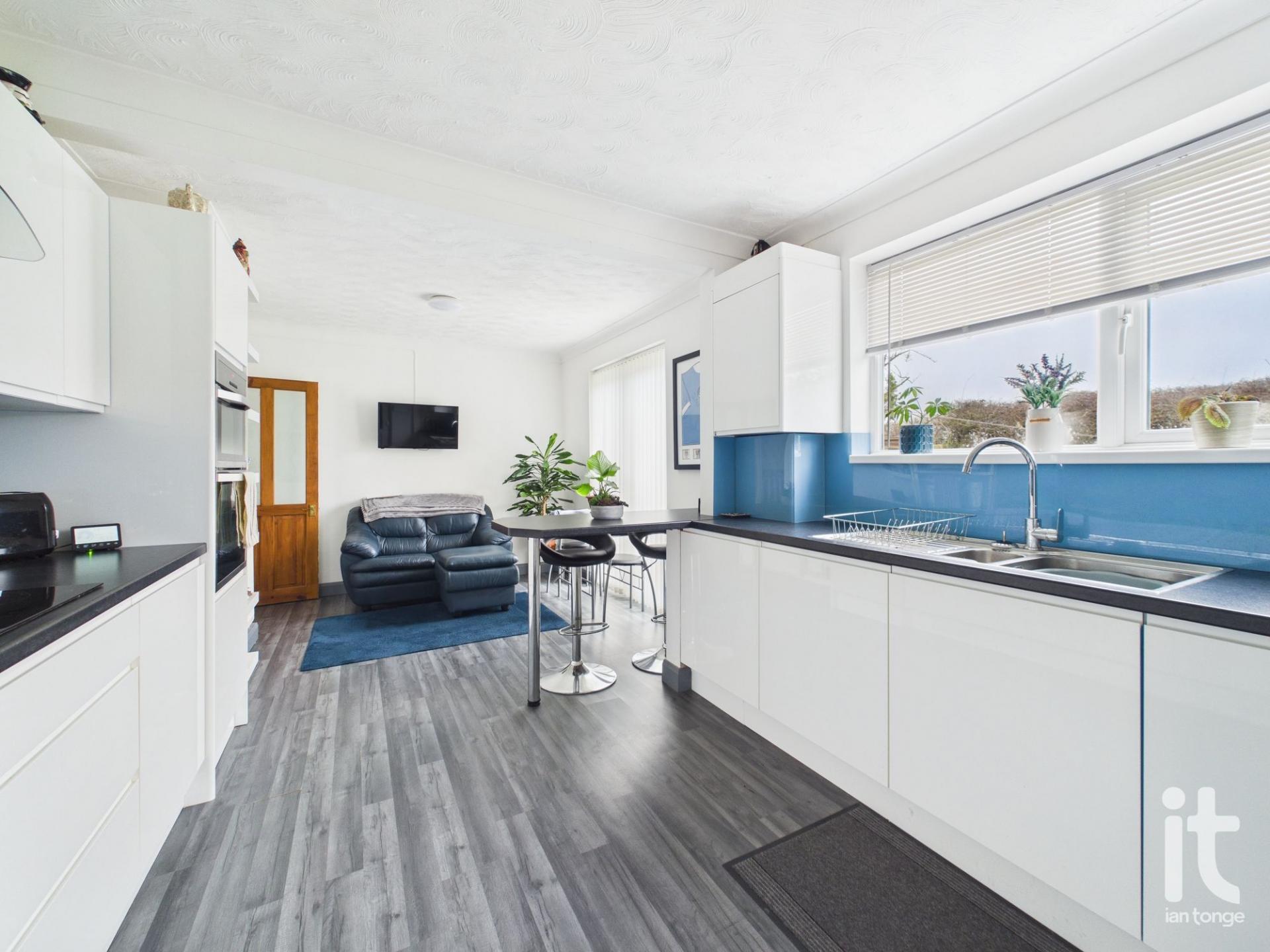 uPVC double glazed double doors to the garden, radiator, range of white high gloss wall and base units, work surfaces with inset drainer sink unit, breakfast bar, double oven, induction hob with extractor hood above, central heating boiler, uPVC double glazed window to the rear aspect, access door the side porch/garden room.