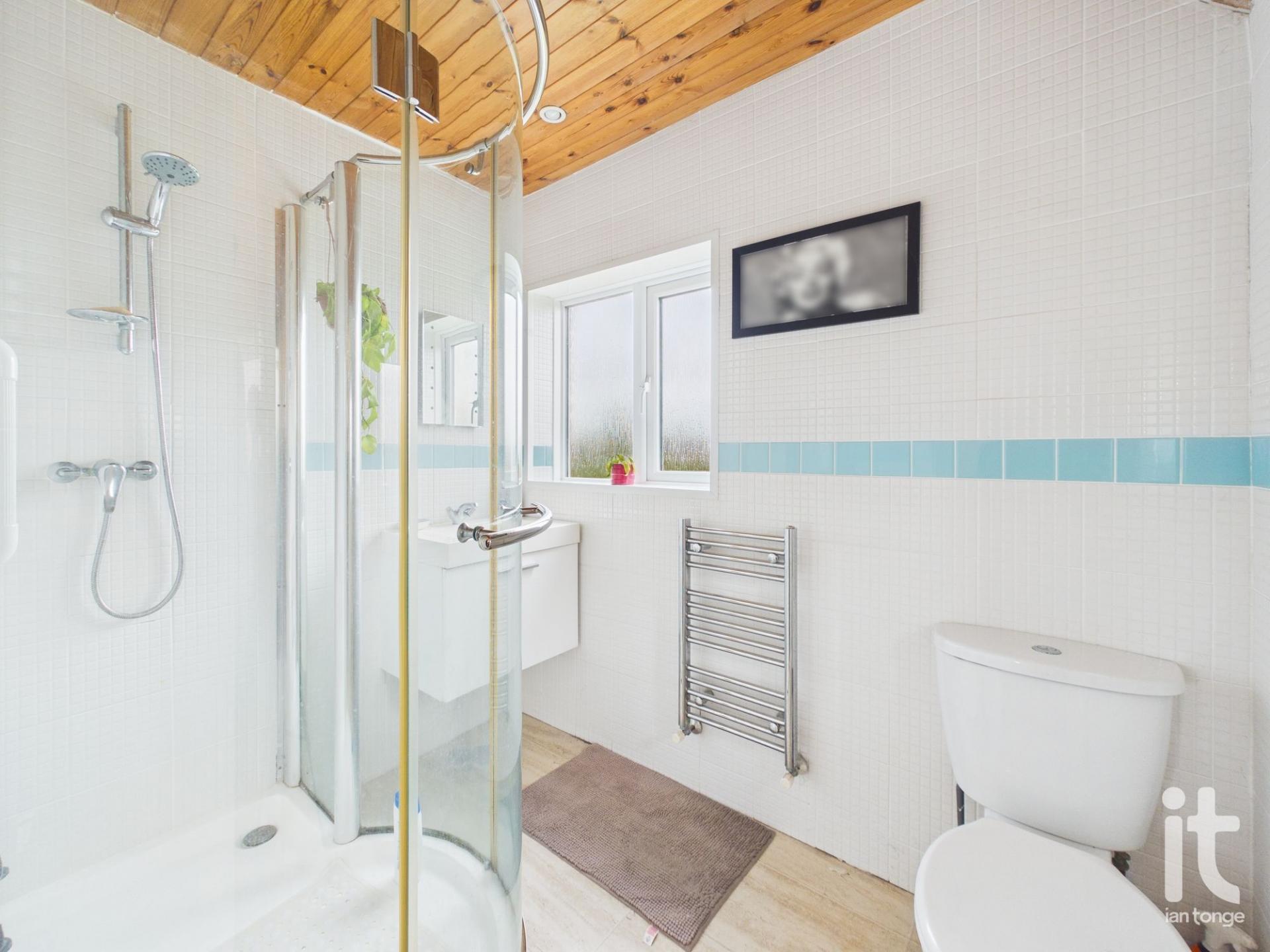 uPVC double glazed window to the rear and side aspect, shower cubicle, vanity sink, low level W.C., tiled walls, chrome towel radiator, ceiling downlighters.