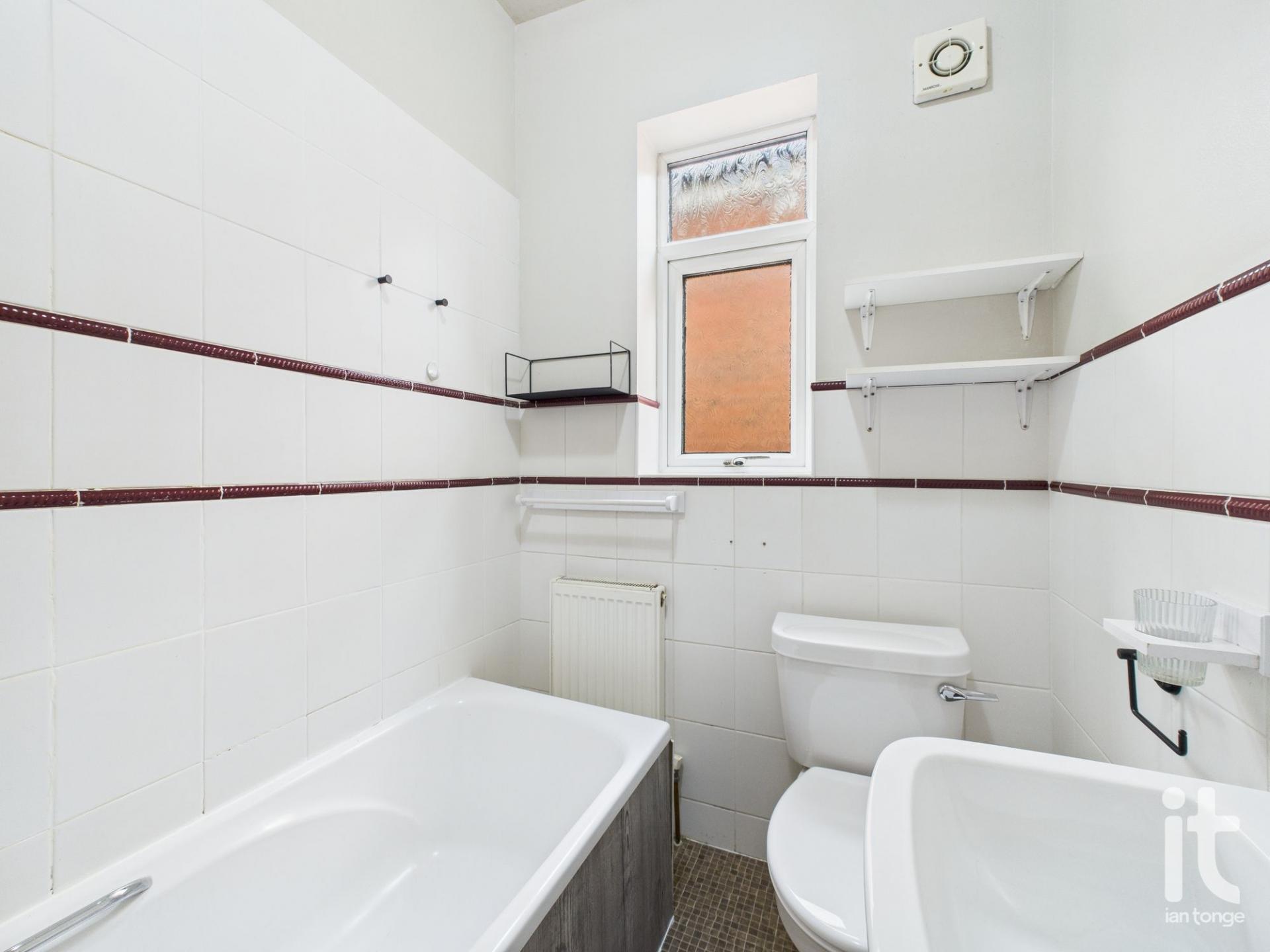 uPVC double glazed window to the side aspect, panel bath with shower over, pedestal wash basin, low level W.C., part tiled walls.