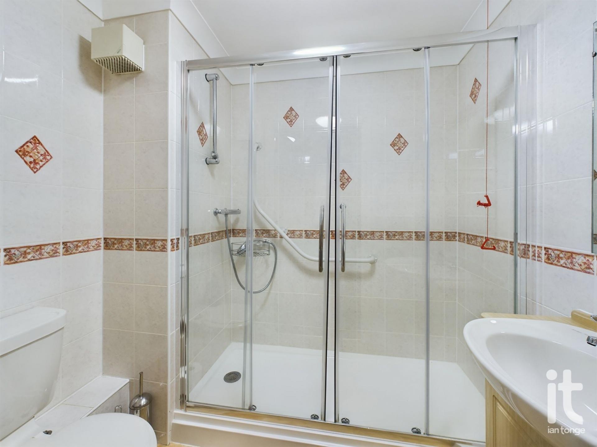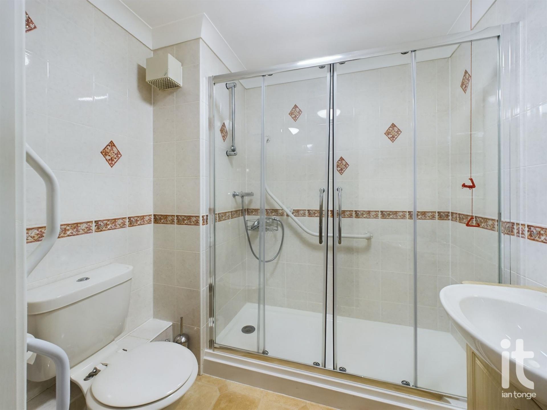 Double width shower cubicle with sliding doors and handrail, vanity sink with storage, low level W.C., tiled walls, security pull cord.