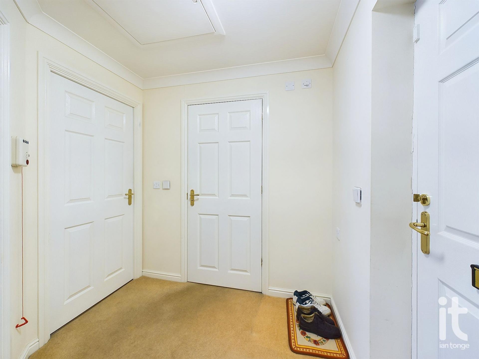 Entrance door, intercom, loft access, storage cupboard with cylinder and electric meter.