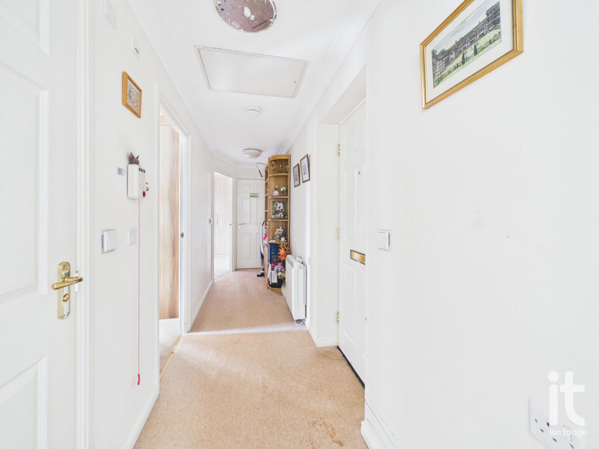 Offered for sale with no onward chain is this delightfully modern two bedroomed third floor apartment situated on the McCarthy & Stone development off Peter Street, next to Sainsbury's in Hazel Grove Village. With spacious accommodation, with fitted Kitchen and shower room and views over the front of the development. The development which is designed for over 60's has a communal lounge, on-site warden with 24 hour emergency call and communal laundry room, parking and communal gardens. The internal accommodation briefly comprises of:- entrance hall with storage cupboard, spacious living room with designated dining area, fitted kitchen with integrated appliances , shower room then two double bedrooms. Please note that if a couple are looking to purchase then one will need to be aged 60+ and the 2nd person 55+. No Upwards Chain.