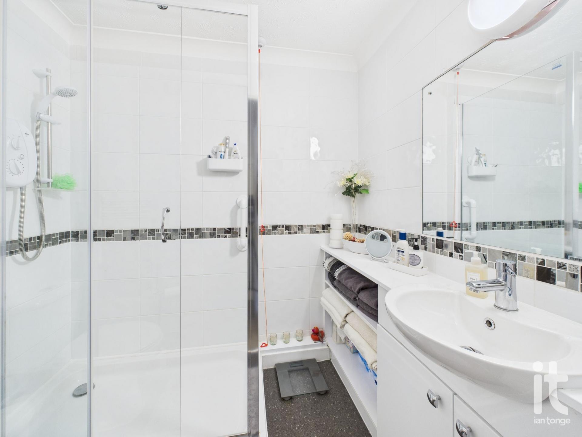 Modern white suite comprising of shower cubicle with Mira shower, low level W.C., vanity sink unit with storage and shelving, Chrome heated electric radiator, extractor fan, tiled walls, vanity mirror with light.