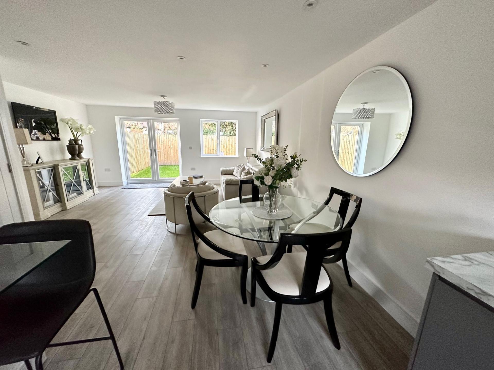 A stylish three bedroomed mews property which offers contemporary living throughout and measures approx 947 sqft. The property consists of hallway with downstairs W.C., feature dining kitchen with stylish fitted Howdens wall and base units and built-in appliances, open plan lounge with double doors leading to the gardens, landing, three bedrooms with en-suite to master bedroom and white family bathroom.  Externally there are lawned gardens and parking. The property also benefits from floor coverings throughout, gas central heating, uPVC double glazing, 10 year House build warranty.