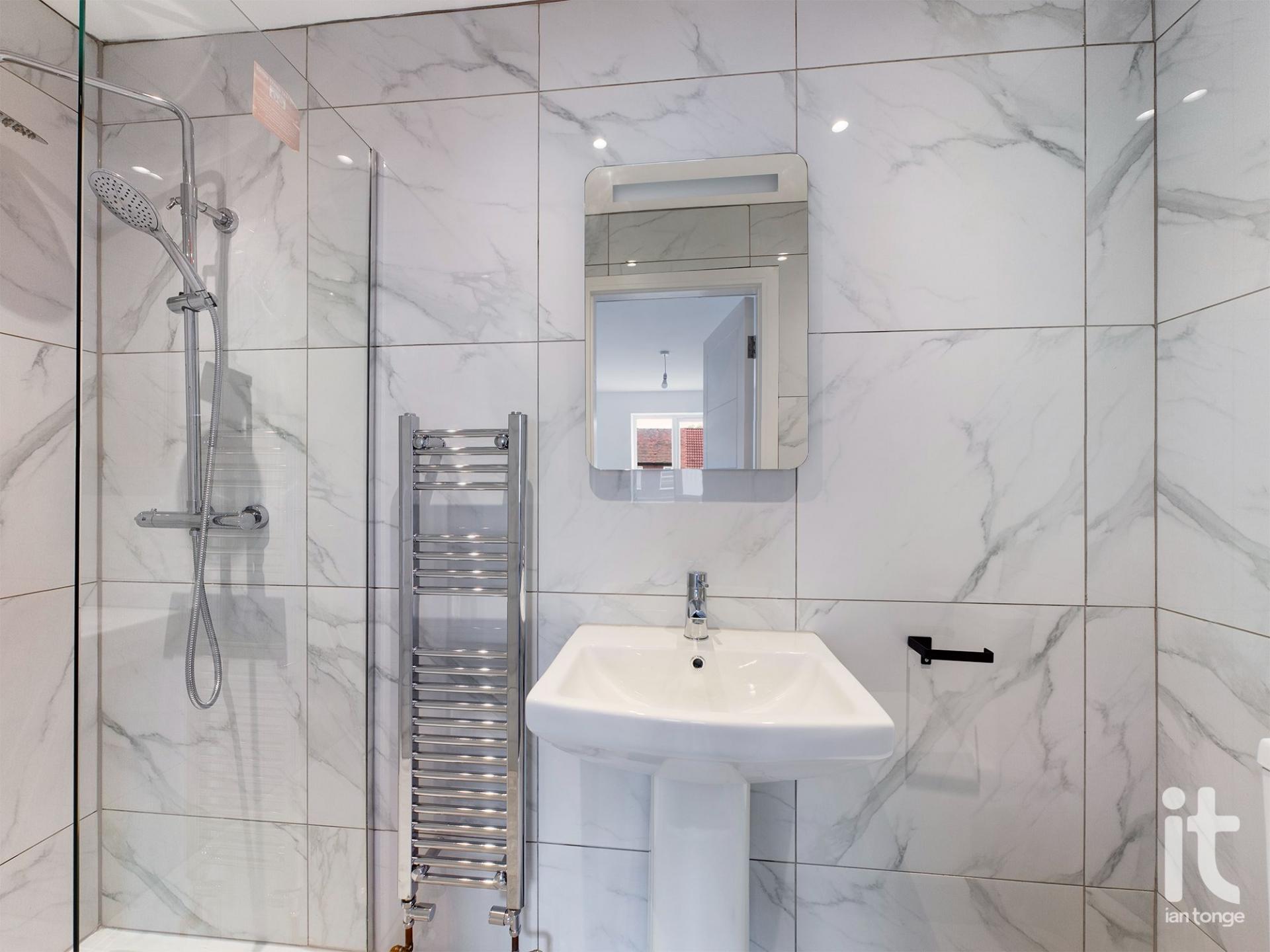 • En-Suite shower room with white suite and calacatta marble effect tiles