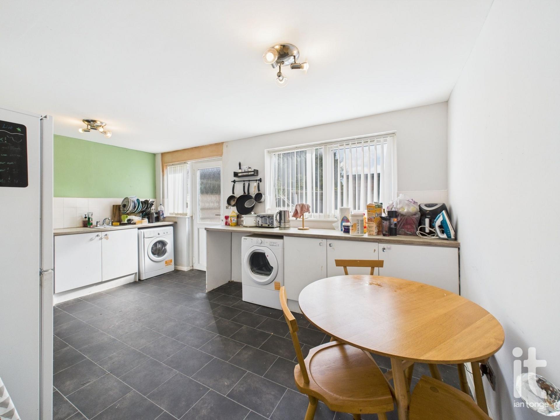 uPVC double glazed frosted external door to rear aspect, two uPVC double glazed windows to rear aspect, eye and base level units with stainless steel sink and side drainer, double central heating radiator, space and plumbing for washing machine, gas cooker and dryer, power points and vinyl flooring.