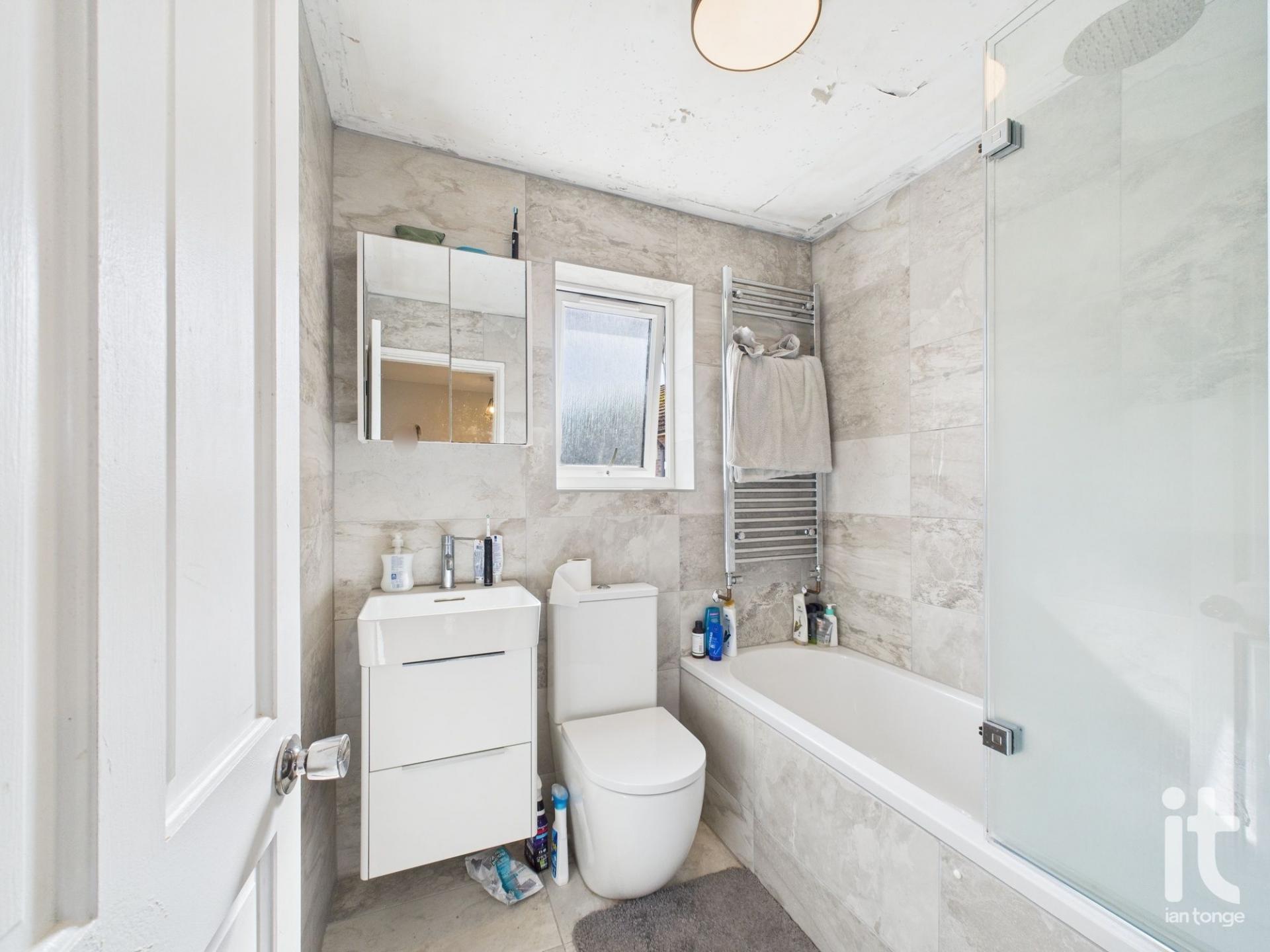 uPVC double glazed frosted window to rear aspect, low level wc, vanity sink unit, shower over bath with shower screen, single central heating radiator, tiled walls, towel radiator.