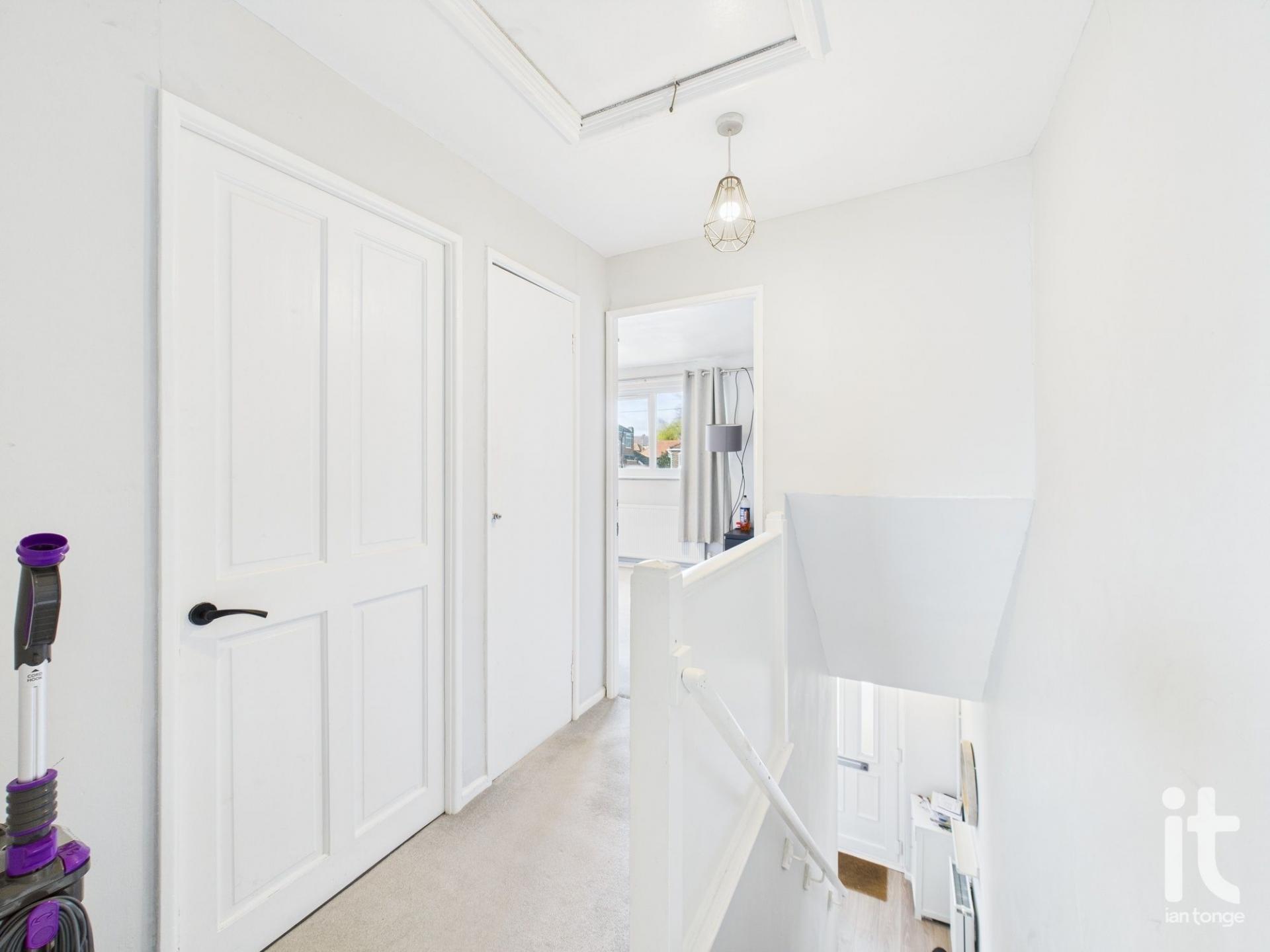 Landing giving access to all first floor rooms, storage cupboard housing combi boiler, power points and carpet to floor.