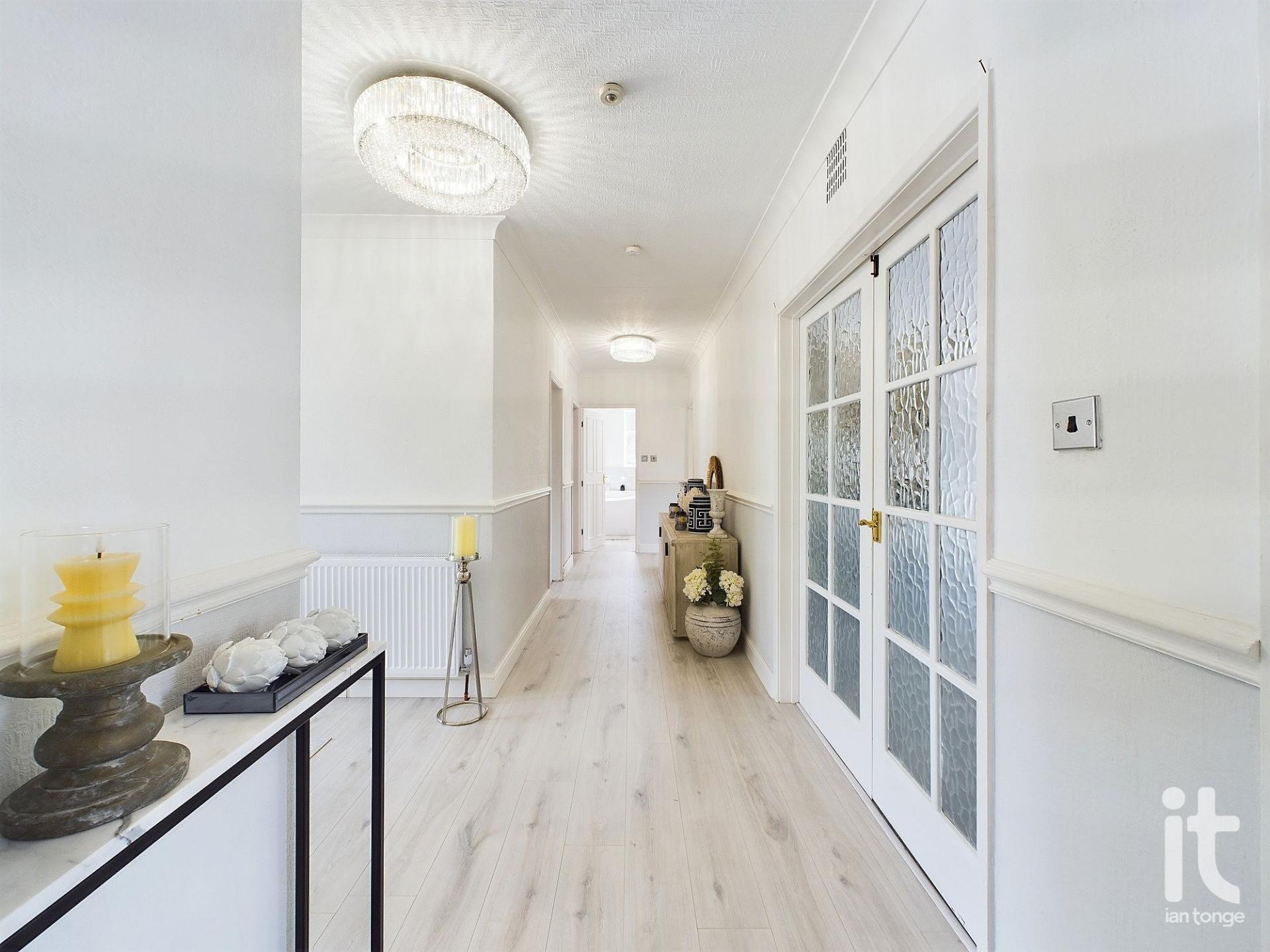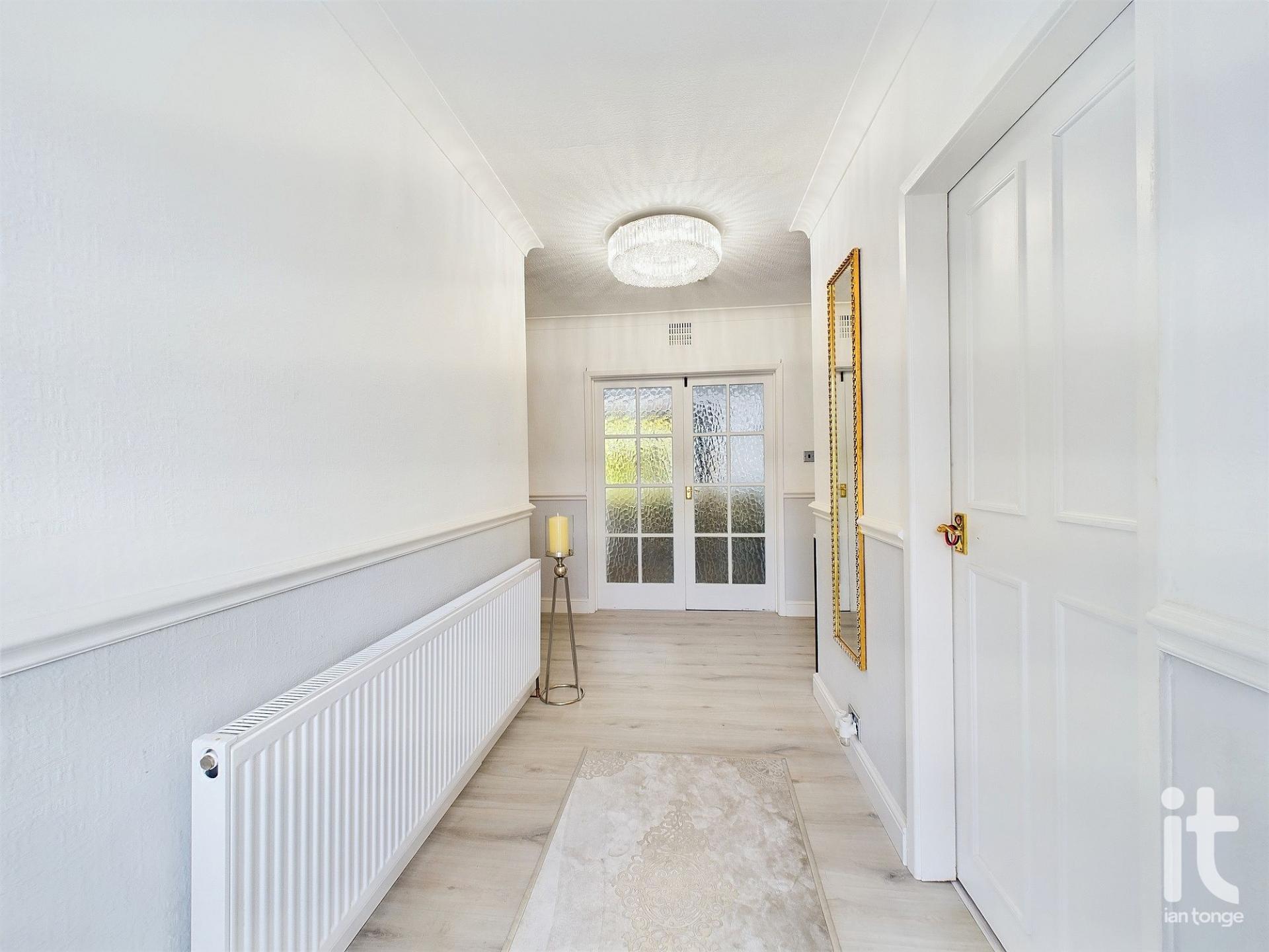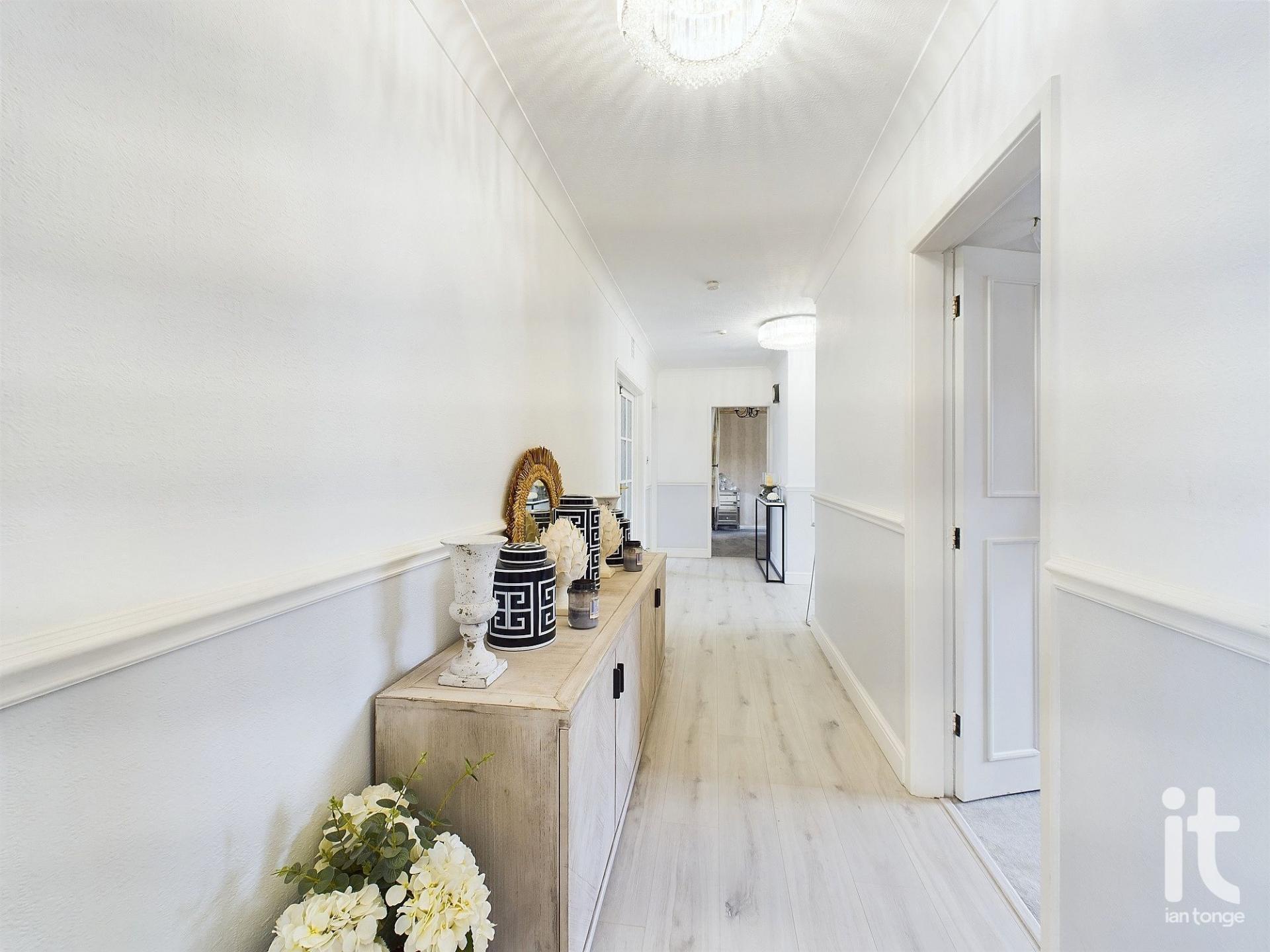 Large T-shaped entrance hallway, radiator, dado rail, coving to ceiling, power points, laminate flooring.