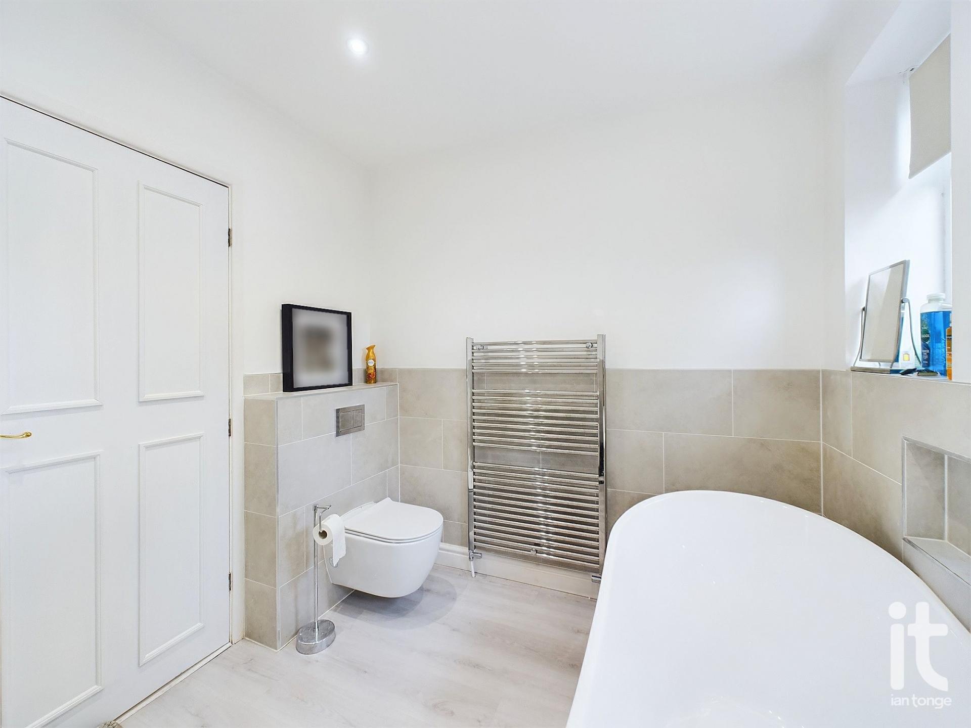 Two obscure glazed windows to side aspect, stylish free standing bath tub, floor stood bath filler with shower head, laminate flooring, tiled walls, towel radiator, toilet, modern pale oak finish sink unit with storage draws, inset tiled and lite shelf behind bath, downlights.